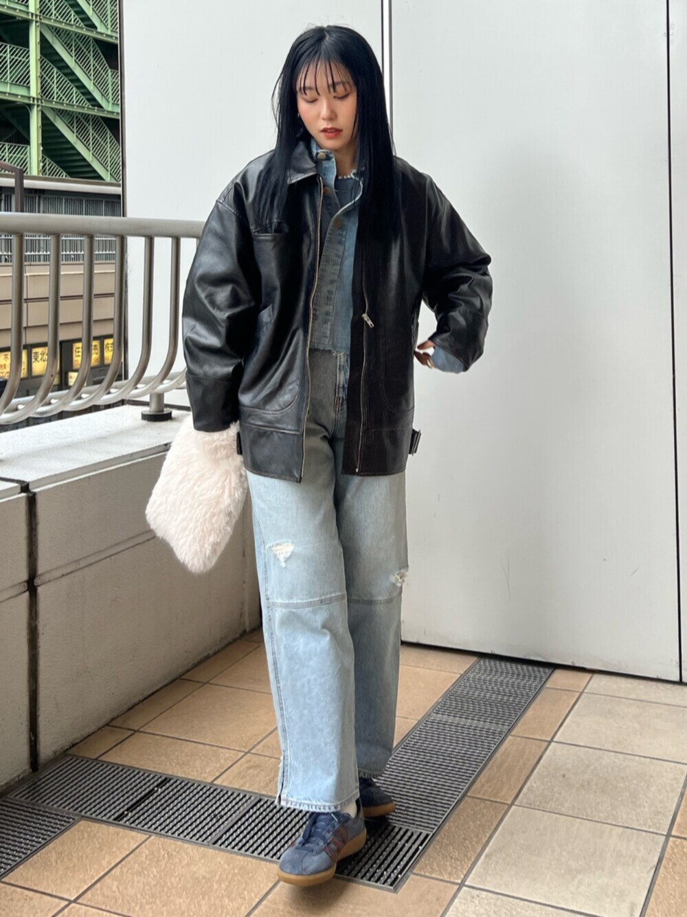 【ブルゾン】 ヴィンテージな風合いのあるレザーブルゾン♡ おしり隠れる程の丈感です! スカートとあわせても甘すぎないスタイリングになるので、着回しもしやすいですよ♡ 【シャツ】 カットオフされているデニムシャツ! 丈はショート丈なのでスタイル抜群に見えるシルエットになっています✌🏻 【デニム】 160cm24inchでくるぶしやや隠れる丈感です!サイドにスリットが入っているので、動きが出て、こなれた印象を与えてくれます! 軽いダメージ加工なので、ダメージ加工が苦手な方もお召頂けますよ✌🏻 【バッグ】 触り心地抜群のバッグ♡ 長財布もしっかり入る程の容量と、ワンポイントにコーデに映えるので、コーデに取り入れやすい商品です!
