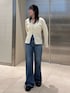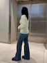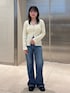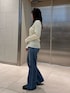 【トップス】 デザインが可愛いニットカーディガンは シルエットがきれいなので、細見えします! 生地は柔らかくて伸び感があるので着心地抜群です! インナーはキャミソールでヘルシーに着ていただくのがおすすめです! 【デニム】 脚長効果抜群のフレアデニム! 少しゆったり履きたかったので、159cmで25inchを着用しております! 3cmくらいの厚底ブーツと合わせて丈感はぴったりでした! すっきり見せたい方はウエスト周りもぴったりのサイズがおすすめです! 小柄さんはヒールや厚底などで合わせて 履いていただくと良いと思います!
