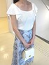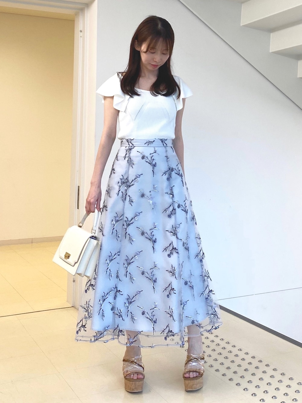 \キレイめコーデ/ トップス→ラッフルがかわいいニットです! ラッフルが腕周りをカバーしてくれるのが嬉しいポイントです。 首元も程よい空き具合で、デコルテラインを綺麗に見せてくれます! 合わせやすくて使いやすい万能ニットです! スカート→刺繍されたブーケ柄が華やかなスカートです! ヒップ下から広がるセミフレアのシルエットなので、広がりすぎずに着ていただけます!