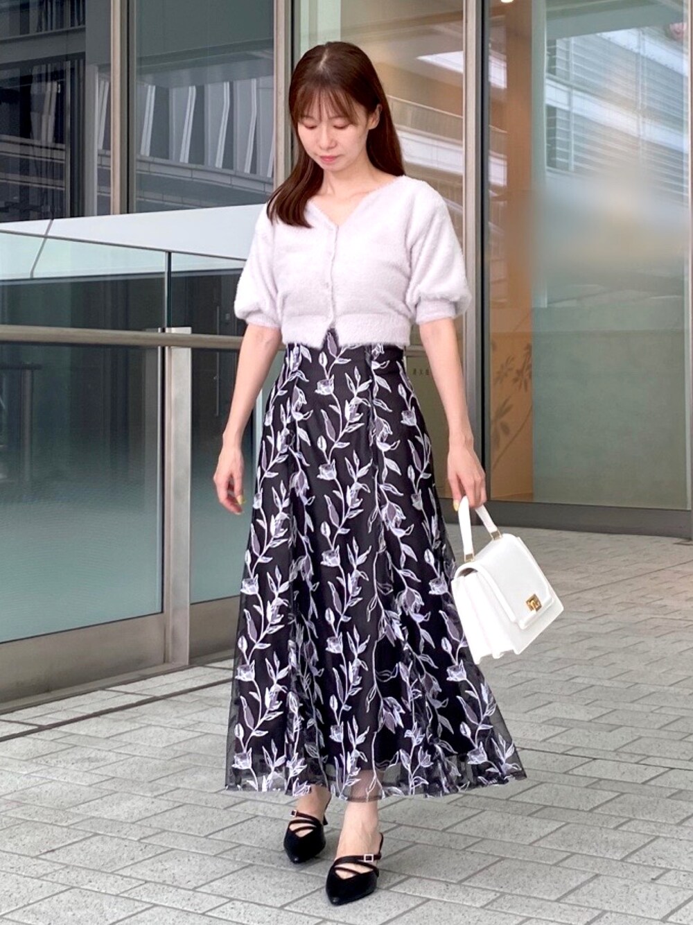 \大人フェミニンコーデ/ トップス→ずっと触っていたくなる程、触り心地の良いジャギーニットです!チクチク感もないので、着心地抜群です◎ パフっとしたハーフスリーブも可愛らしいポイントです♡ スカート→ラメ糸を使用しているので、キラキラと華やかなチュール刺繍スカートです! 程よいマーメイドラインがシルエットを綺麗に見せてくれます。 シューズ→ストラップ使いがポイントのミュールです! 足にフィットし、ヒールも高すぎないので、履きやすいです◎