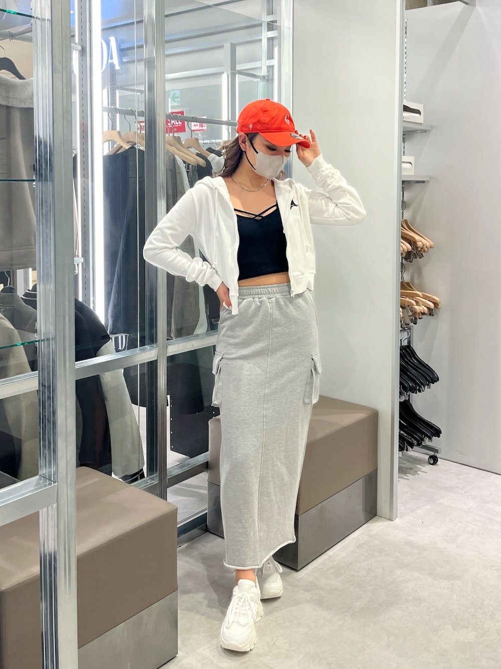【インナー】 GYDA定番アイテムのバインダービスチェ!夏はトップスとして、冬はインナーとして、年中使えます! 【トップス】 胸元にGYDAのGの文字が刺繍されている、シンプルなデザインのパーカーです! ショート丈になっています! 【ボトムス】 カーゴデザインのスウェット素材でできているスカートです!サイドポケットが腰の張りが気になる方でもカバーしてくれて、脚が長く見える位置に付いています!後ろ側にスリットが入っているのもポイントです! 【キャップ】 NEW ERAコラボアイテムです!オレンジのカラーがコーデの差し色になっています! 【シューズ】 シンプルなメッシュスニーカーです!厚底なのでさりげなく盛れます!かかと部分にGYDAの文字があしらわれているので、後ろから見ても可愛いです!