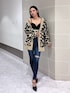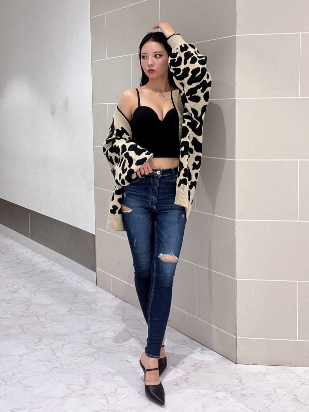 【アウター】レオパード柄のニットカーディガンです🐆ゆったりシルエットでミニボトムスと合わせてワンピース風な着用も可愛いです♡ 【インナー】GYDA定番のリブベアビスチェに肩紐が付いて登場しました✨肩紐は取り外しできるようになっています◎ 【ボトムス】太もものサイドにスリットが入っているダメージスキニーデニム👖初めてハイウエストが発売されました✨おへそが隠れるくらいの股上です!(164cm/XSサイズ着用) 【シューズ】GDロゴのMOLDがポイントのミュールです👠MOLDとチェーンは取り外しできるので、シンプル使いも可能です◎(24cm/Lサイズ着用)