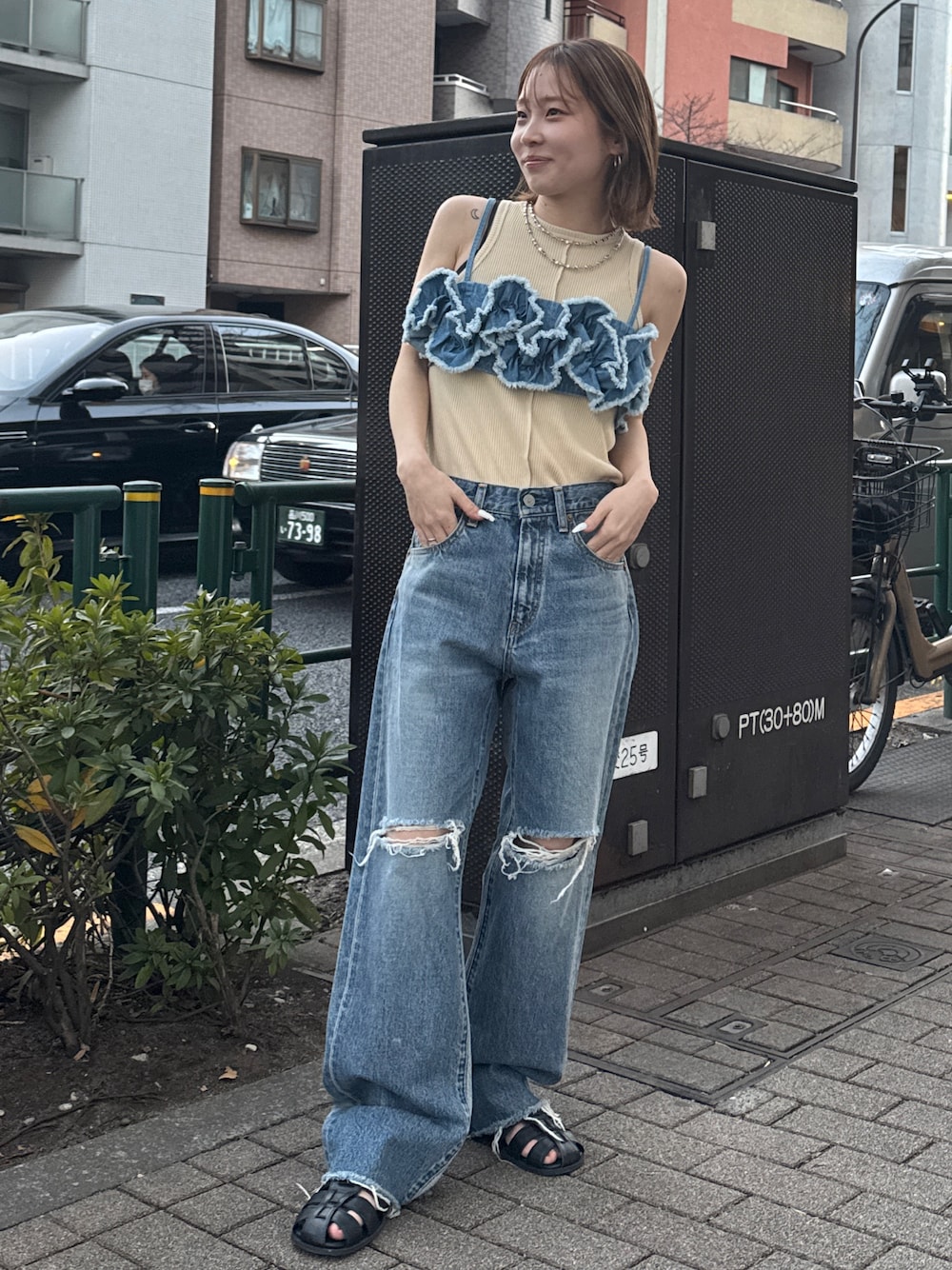 辻岡雅(Ungrid)のキャミソール「フリルデザインデニムビスチェ」を使ったコーディネート