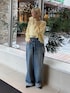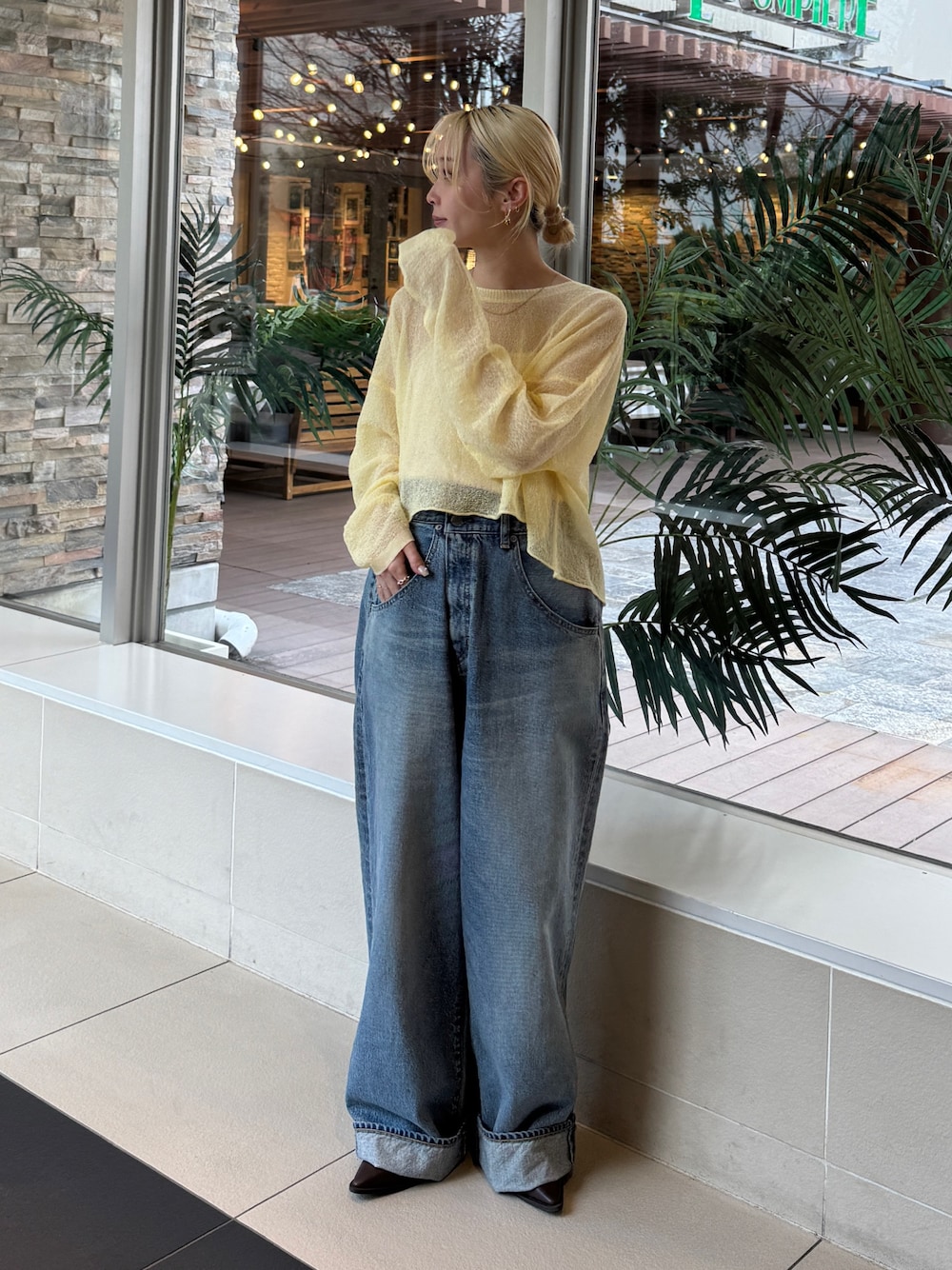 【トップス】 少し透け感があるニットは春夏秋と使える万能ニット🧶 ブルーのデニムに映えるyellowカラーでおしゃれ上級者に🌟 ボトムスに程よくかかるくらいの丈感なのでINしなくても⭕️ 【デニム】 148cm/24inch 着用 かなりハイウエストなデザインで、ゆるっと着用いただけます。 150cm以下の方はかなり裾が長めなので、 ロールアップがオススメです!!