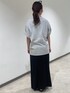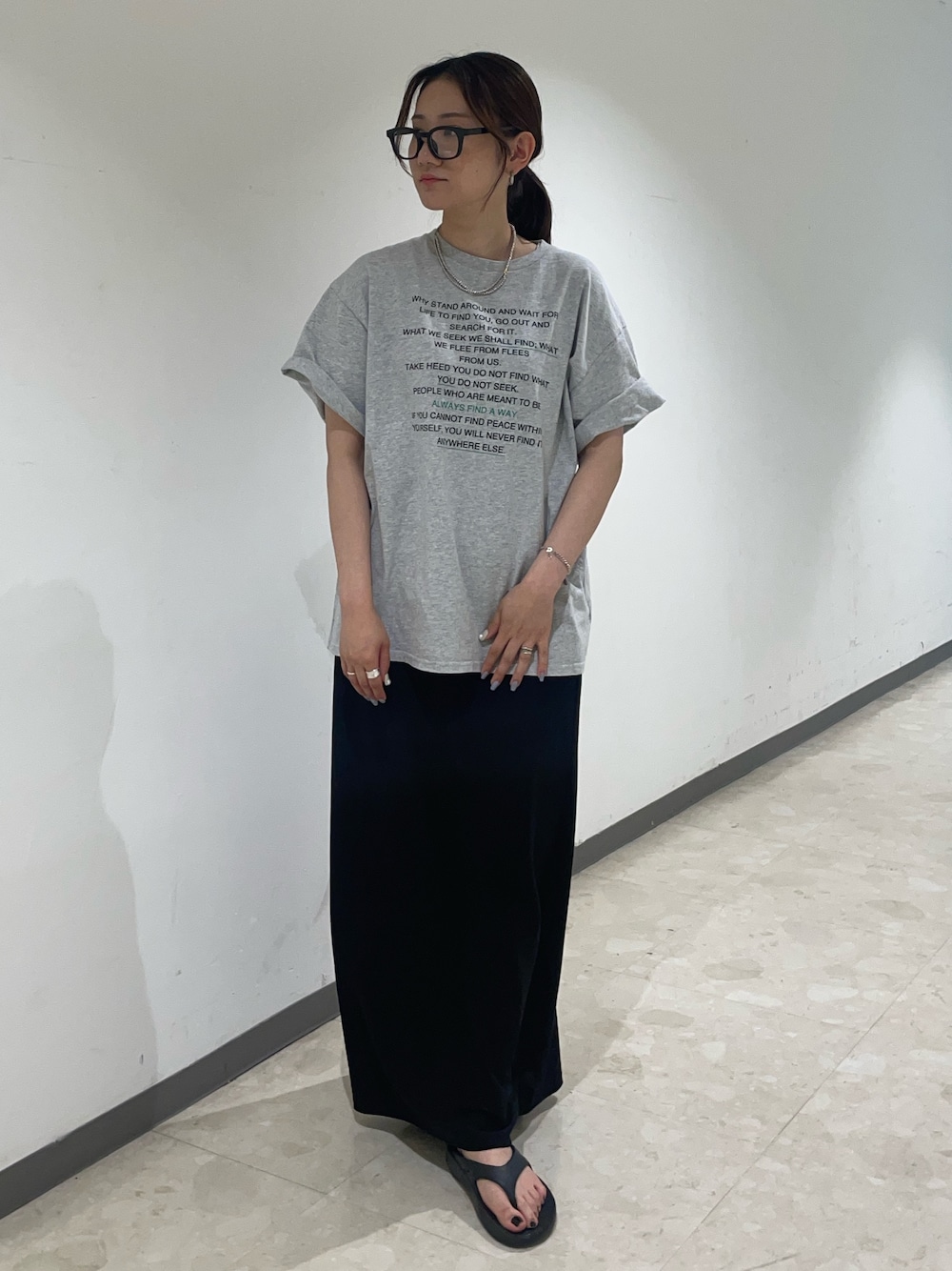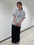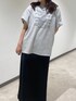 【トップス】 綿素材100%のTシャツ。 肌触りが気持ち良く生地も厚すぎないのでさらっと着られます🙂↕️ フロントの英語のデザインがとてもおしゃれで、上から何か羽織物を着てもロゴが見えるのがいいですね🎶 身長157㎝でアウトするとヒップ隠れるので、タイトスカートで合わせてみました! 【スカート】 さらっとつるっとした素材で涼しげな一枚。 身幅がそこまでタイトすぎないので、骨格ウェーブさんでも安心して履いていただけます。 後ろに深めのスリットが入っているのでハイカットのスニーカーやカラーのソックスをチラッと見せるのも可愛いです。 身長157㎝でゆったり履きたくてMサイズを着用したのですが、ウエストが少しルーズで丈がシューズによっては擦ってしまうので一つ外側に折り曲げて履くと、サンダルでも擦らず足首より少し下あたりで履けました✨ 【メガネ】 ワイドのフレームがおしゃれな雰囲気を出してくれます。シンプルなTシャツコーデのアクセントに使えますよ🫶🏻