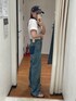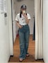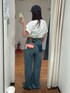 【トップス】 キティちゃんのデザインが可愛い1枚、 店頭では白が人気です🤍 サイズ感は少しゆったりしていて、白は透け感がそんなに目立たないくらいの厚さでした! キティちゃんお好きな方は是非🤍 【デニム】 Levi's別注のデニム履いてみたら形が綺麗で感動しました😭😭 ストレートデニムですが、程よくルーズなので足のラインもそこまで拾わず、Ungridのデニムより少し股上が浅いのでウエストの締め付け感が気にならなかったです! 色味も少し黄色ぽい感じがUngridのデニムとはまた違って、裾のダメージ加工もカジュアルで味が出ております!! シルエット以外にも何より柔らかくて、本当に履きやすかったです😭 身長157センチで25インチを着用したのですが、丈はフラットシューズだと少しずるくらいで、24インチ着用してみたら(写真はないです)ずらなかったです!
