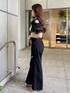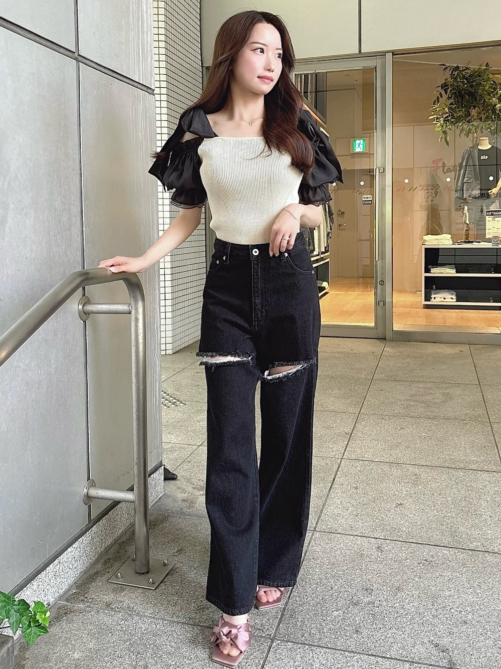 肩リボンがかわいいトップス♡ 長さはお好みに合わせて調節可能! ブラックデニムとピンクのサンダルをあわせて甘めカジュアル♪