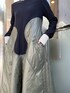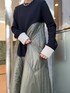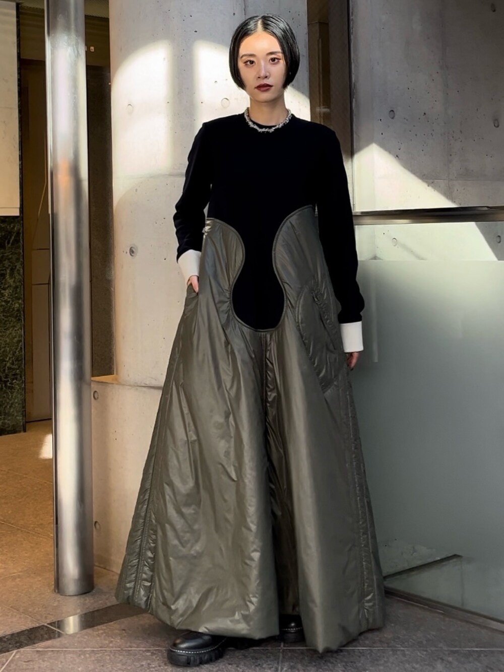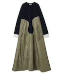 【ワンピース】 UN3D.らしい異素材MIXデザインのワンピース。 今季は、中綿を入れたキルティングをウェーブ状にドッキングさせた、とびきりモードなデザインになっています。 綺麗なAラインのフレアシルエットの作りなので、上半身は華奢見せ&下半身はカバーしてくれて、かつ目線が上にいくので、すらっとしたスタイルに。内側は裏起毛になっていて、全身しっかりと暖めてくれる防寒性に優れたアイテムです。 【シューズ】 3種類の素材をミックスさせた異素材ドッキングブーツ。 見た目以上に、軽く歩きやすい作りでソールも一般的なものよりも厚めに作られているので、身長も高みえします!