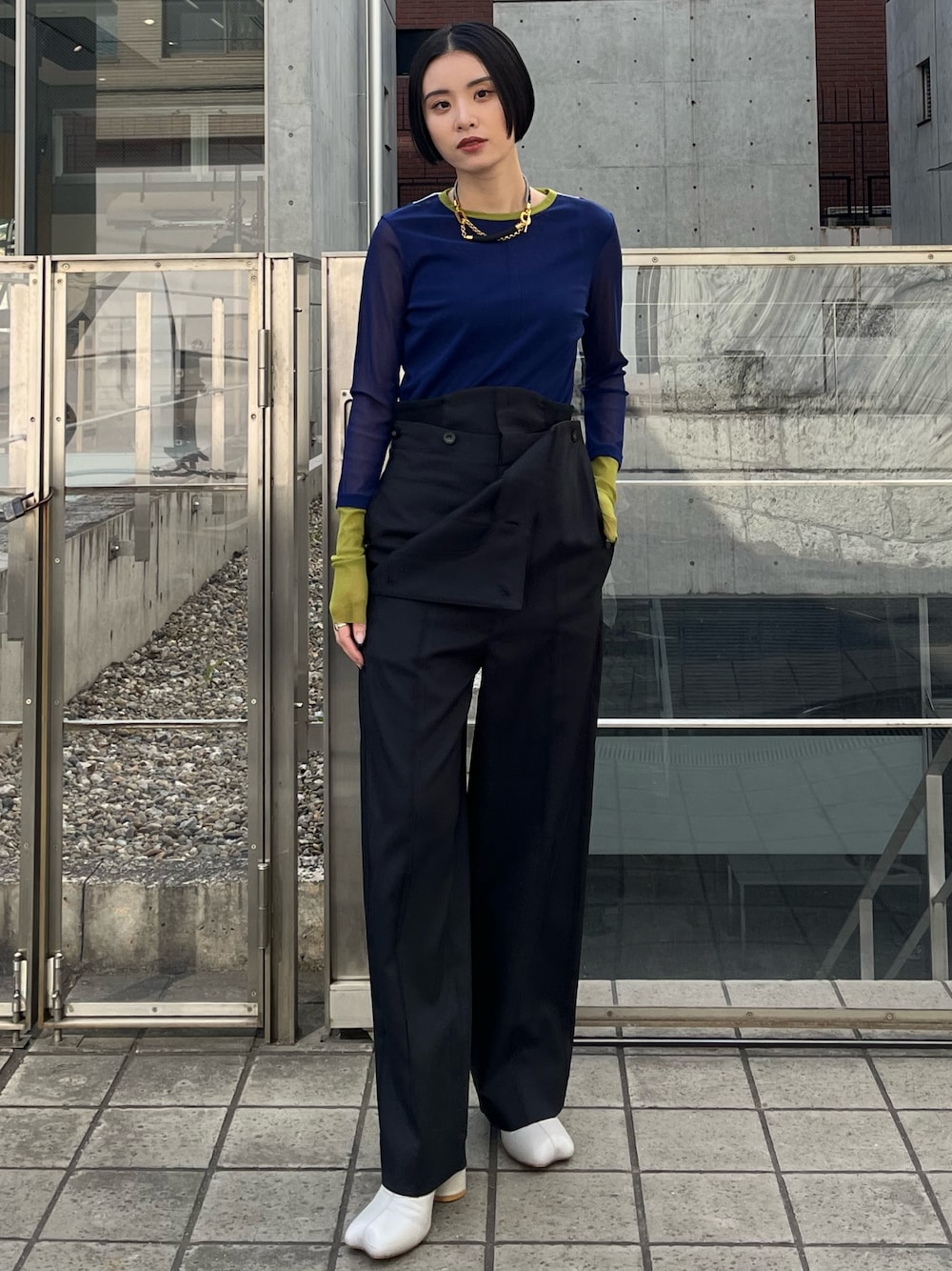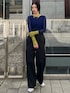 【トップス】 肌触りのいい、他にはない配色カラーが可愛いシアートップス。 1枚持っているだけで、重ね着やトップスとしても着用可能で、今季を象徴するWAVEデザインがバックに落とし込まれているところもポイント。 【パンツ】 かなりハイウエストの作りで、脚長効果抜群のワイドテーパードパンツ。 レイヤード風のデザインになっており、ボタンはつけても外してもお好みで着用可〇。 ウエスト周りも細見えするのでスタイルアップ間違いなしです。 【シューズ】 足袋風の、つま先デザインが可愛いショートブーツ。 軽量かつ歩きやすいブーツで、指部分は意外にも足先に当たらず心地よく履けるブーツとなっています。