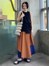 【トップス】 一見シンプルながら、フロントのドレープが一癖あるノースリーブトップス。 フロントと、後身頃で生地が違っていて、後ろはハリのある布帛生地になっているで、意外にもメリハリがしっかりとあるトップス。 どんなボトムとも喧嘩しないデザインが推しポイントです。 【パンツ】 毎シーズン出る度に大人気な定番ボトム。 一見、スカートに見えるオシャレデザインですが、スカート苦手なんだよなぁ…という方でも、こちらなら履きやすいのでオススメです。カジュアルにもキレイめなアイテムとも、合わせて使いやすいボトムスとなっています。 【シューズ】 全体的にぷくっとしたデザインが特徴的な、フラットサンダル。 デザイン通り、底もクッション性が高いので履いてても非常に疲れにくく設計されております。 見た目も他にはないデザインなので、暑い時期の日々のコーディネートの大活躍になること間違いなしです。 【バッグ】 今季のテーマである“WAVE”デザインを大胆に落とし込んだトートバッグ。 内袋は取り外し可能なので、お好みで使い分けることができます。