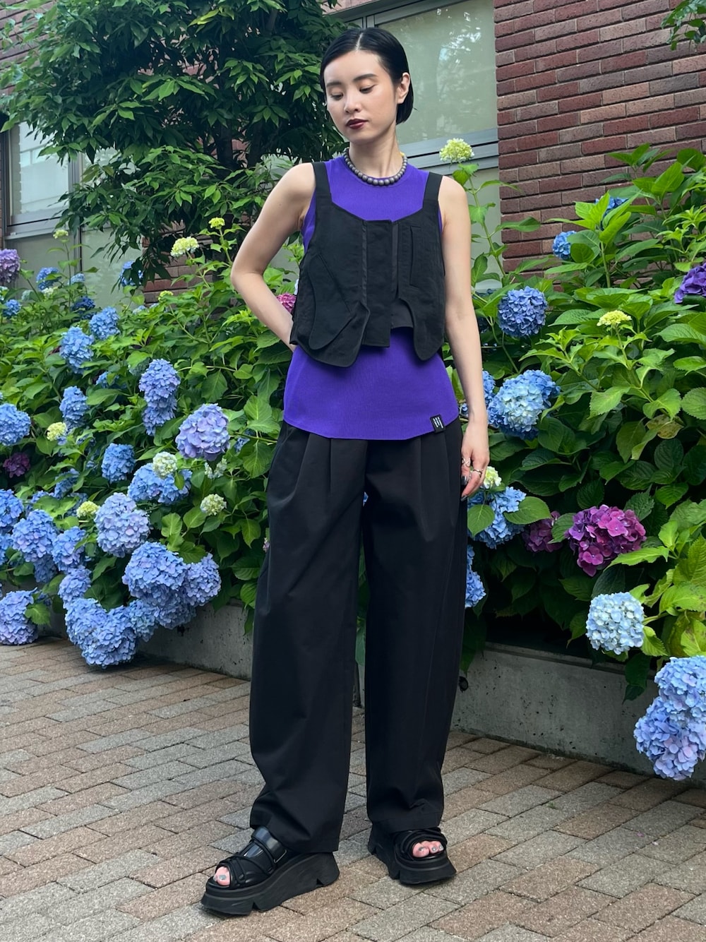 【ビスチェ】 今季のシーズンテーマである《ミリタリー》を象徴するアイテムのひとつ。 独特なヴィンテージ感のある風合いが、カジュアルになり過ぎずにお召頂けます。 インナー次第でオールシーズン着用可能な為、着回しや雰囲気変えにピッタリです。 【タンクトップ】 アメリカンスリーブタイプの、リブニットタンク。 脇肉を綺麗に自然にホールドしてくれる、細見えタンクトップです。 ニットですが、接触冷感の生地仕様なので真夏も安心して着用できます。 【パンツ】 一見シンプルなパンツですが、履けばわかる綺麗なシルエットがポイントのコクーンパンツ。 デザイナーが特に拘った、シルエットは足のラインを誤魔化し綺麗に見せてくれたり、センタープレスデザインや、UN3D.ではレアなベルトループ付きのデザインが、カジュアルからキレイめまで幅広くコーディネートができます。 【シューズ】 スポーツサンダルを、UN3D.らしくモードに仕上げたシューズ。 ボリュームソールで、背も高見えしますし、なにより軽いので一日中履けます。 足の甲部分の、デザインは外側に足の形に合わせて開くので、様々な足の形に合わせて履けるところも嬉しいポイントです。