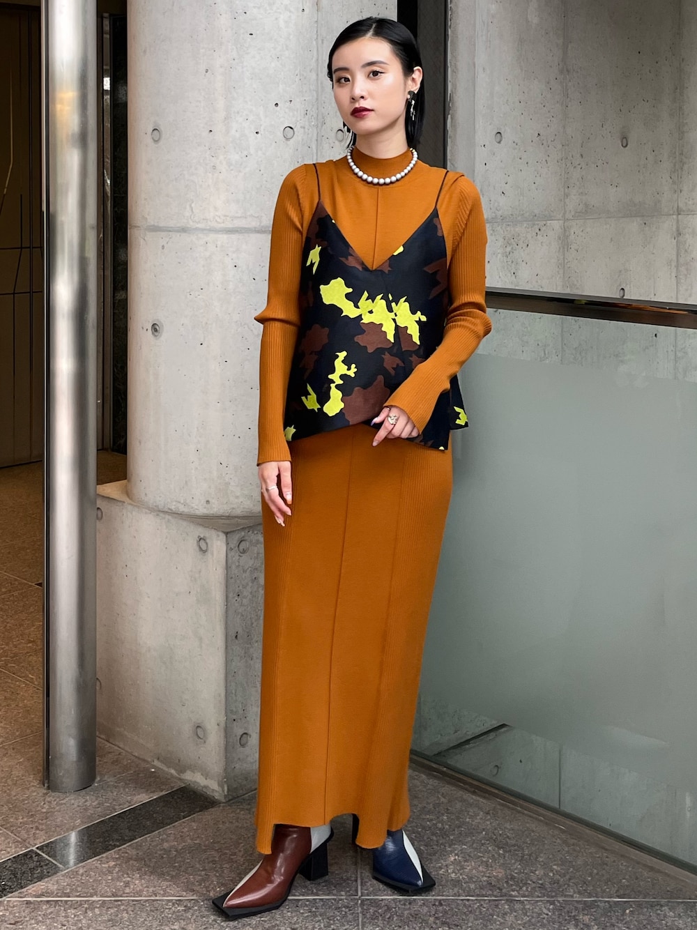 【ワンピース】 UN3D.定番でお作りしているベーシックなニットワンピース。 こちらは、ストンと綺麗に落ちるIラインがお腹周りやウエスト周りの女性の気になる箇所を、拾わずに楽に着れるので秋冬に重宝間違いなしのベーシックワンピースです。 腕は、肩の付け根からリブ編みになっているので華奢見え効果も◎ 【キャミソール】 今季のテーマである“ミリタリー”を象徴とした、UN3D.オリジナルのカモフラ柄をふんだんに使ったキャミソールビスチェ。 普段のシンプルなお洋服に、サッと合わせるだけ。インナー次第で雰囲気を変えて、比較的オールシーズンに使いやすいアイテムなのも嬉しいポイント。 【シューズ】 ポインテッドデザインが特徴のあるブーツ。 モードさを足すために、ソールはあえてポインテッドに合わせてないスクエアソールのデザインですが、軽くて履きやすくシンプルなコーディネートにも映えるおすすめシューズです。