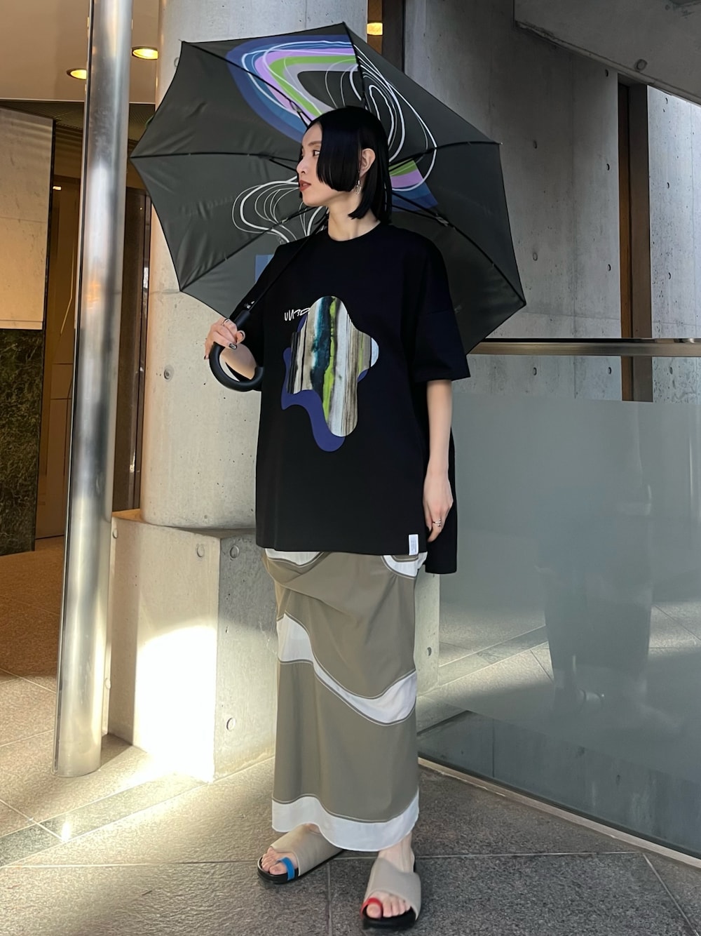 SAYURI(UN3D.)の長傘「STRATUM PRINT UMBRELLA / ストレイタムプリントアンブレラ」を使ったコーディネート