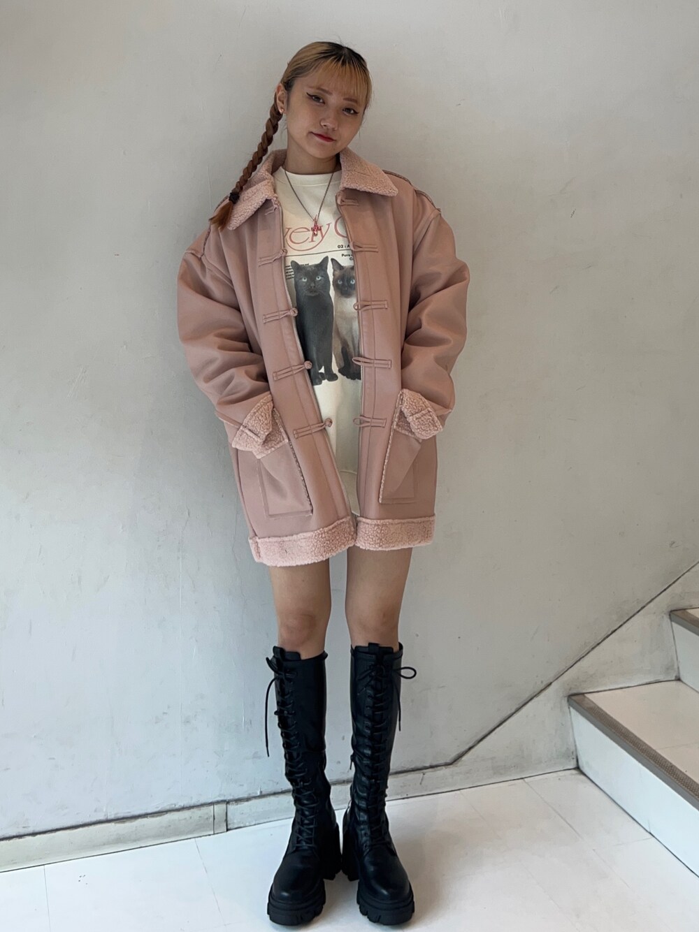 甘め冬のムートンコーデ🩷⛄️ 【アウター】チャイナディテールが可愛いムートンジャケット🫶157センチでおしりが隠れるくらいのオーバーサイズなのでゆったり着れます❕ 【プルオーバー】猫のプリントが可愛いプルオーバーは1枚でミニワンピっぽくでも、パンツ合わせでも使える万能アイテム🔥カラー別に猫の感じが違うのもポイント⭐️