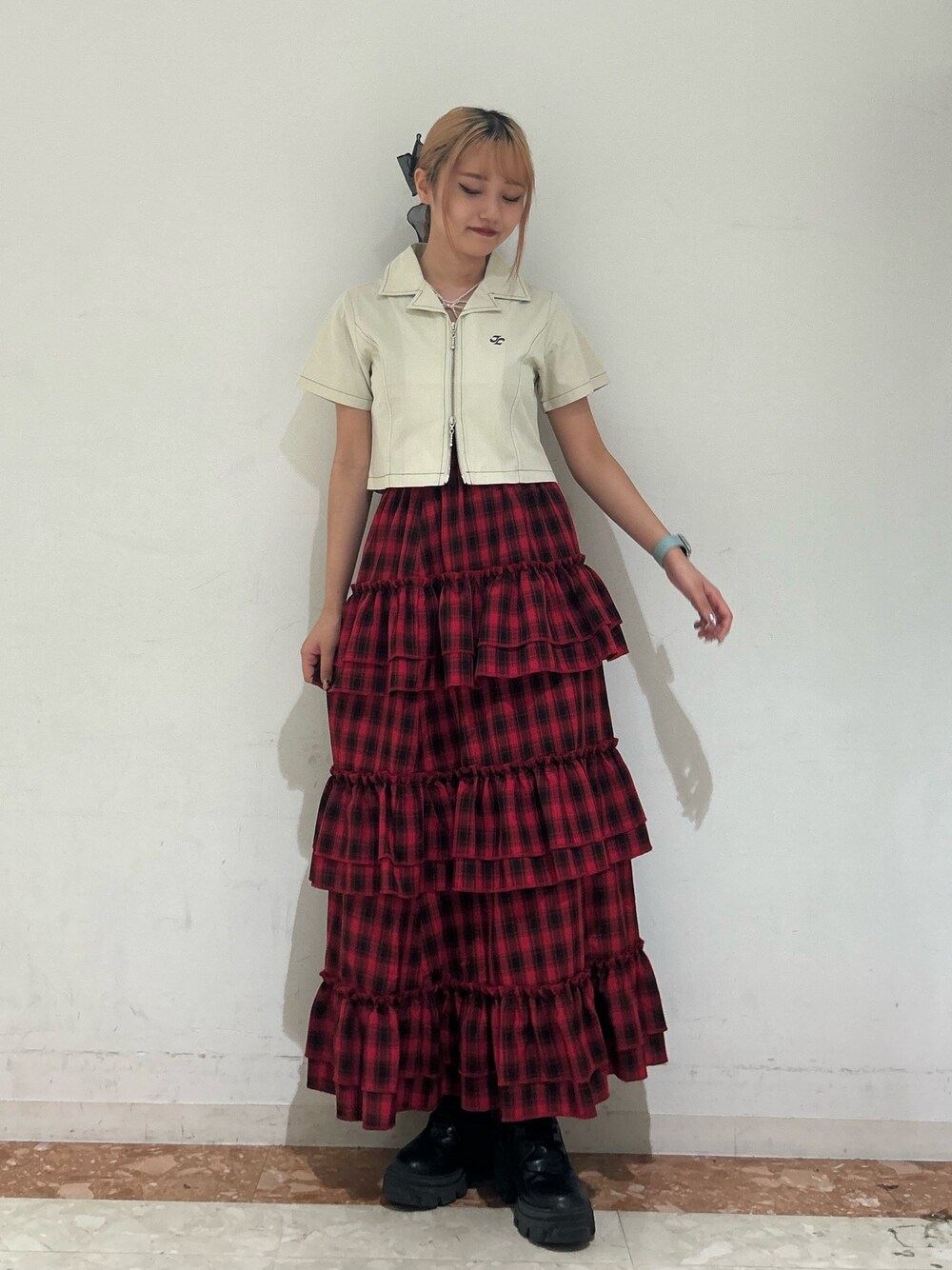 【シャツ】コンパクトなサイズ感で脚長効果🙆♀️上下ZIPなので中にカラーのインナーを着て見せてあげても可愛いです! 【スカート】ティアードのデザインが可愛いスカートはTシャツと合わせてあげるだけでもオシャレ上級者コーデが出来上がるアイテムです!🥰