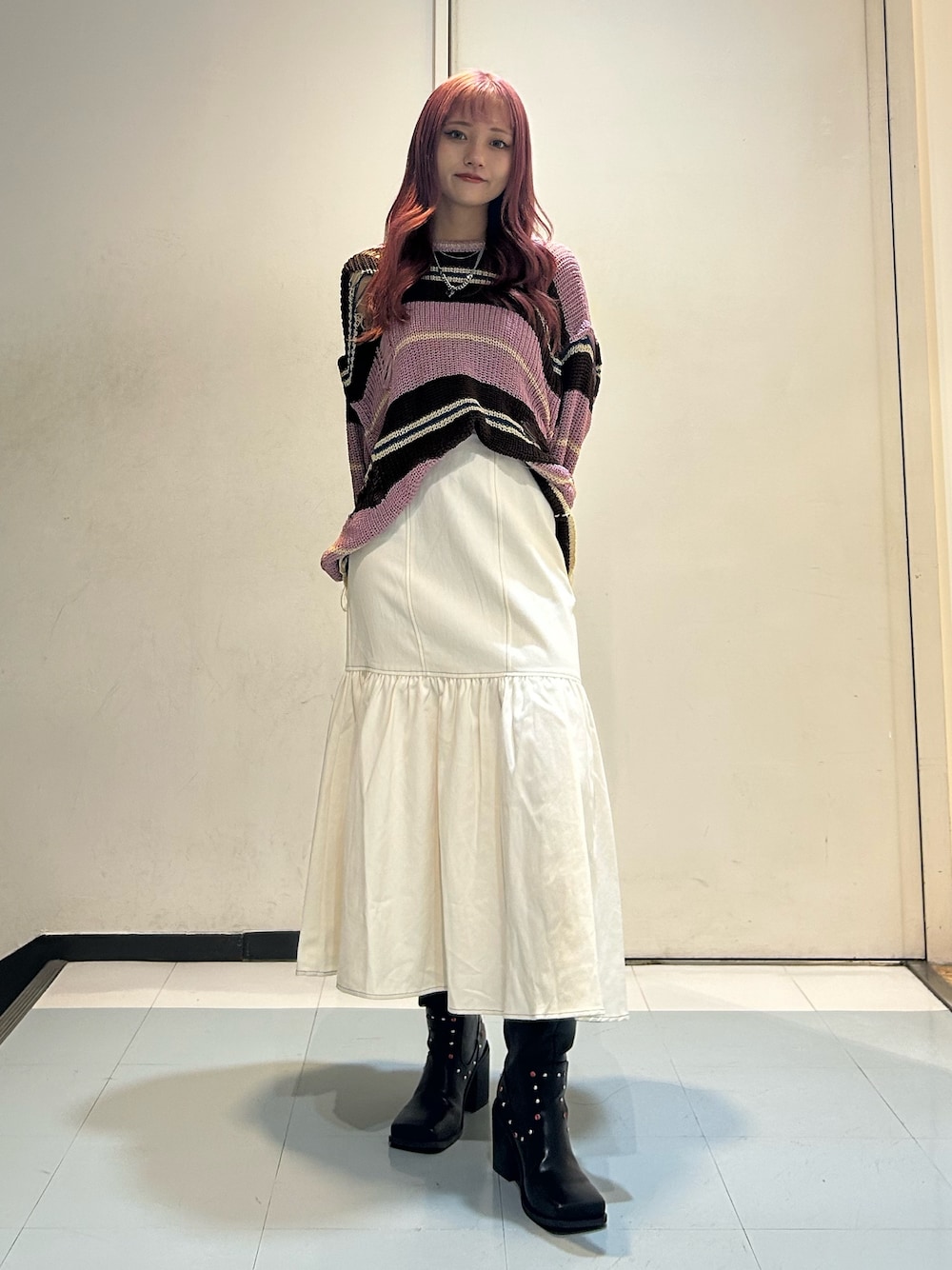 【ニット】去年大人気だったマルチWAYニットから新色登場❕157センチでヒップが隠れる長さなのでミニで合わせるのもオススメ🩷 【スカート】jouetie定番のセットアップがNEWデザインで登場しました💖女性らしいマーメイドスカートの形で単品使いも出来ちゃいます❕ 【ネックレス】ハートモチーフが可愛いネックレス♥️主張しすぎずさりげなくコーデのポイントになります❕ 【ブーツ】今季流行りのウエスタンディテール スタッズとスクエアの形がコーデのポイントになります🩷22.5cmでMサイズ着用してます!