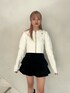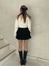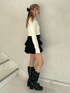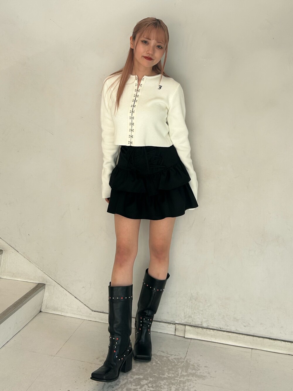 【カーディガン】1枚着でトップスとして着てもかわいいカーディガンは胸元のjouetieのロゴがさり気なくて可愛い🩷厚すぎない生地感なので幅広いシーズンできて頂けます❕ 【ボトムス】中にパンツが付いてるスカートなので1枚で安心💖フロントのレースアップデザインがポイント🫶ハイウエストなので脚長効果抜群😆 【ブーツ】今季流行りのウエスタンディテール🩷スタッズとスクエアの形がコーデのポイントになります❕足のサイズ22.5センチでMサイズ着用してます!