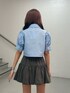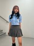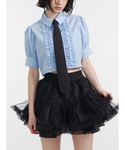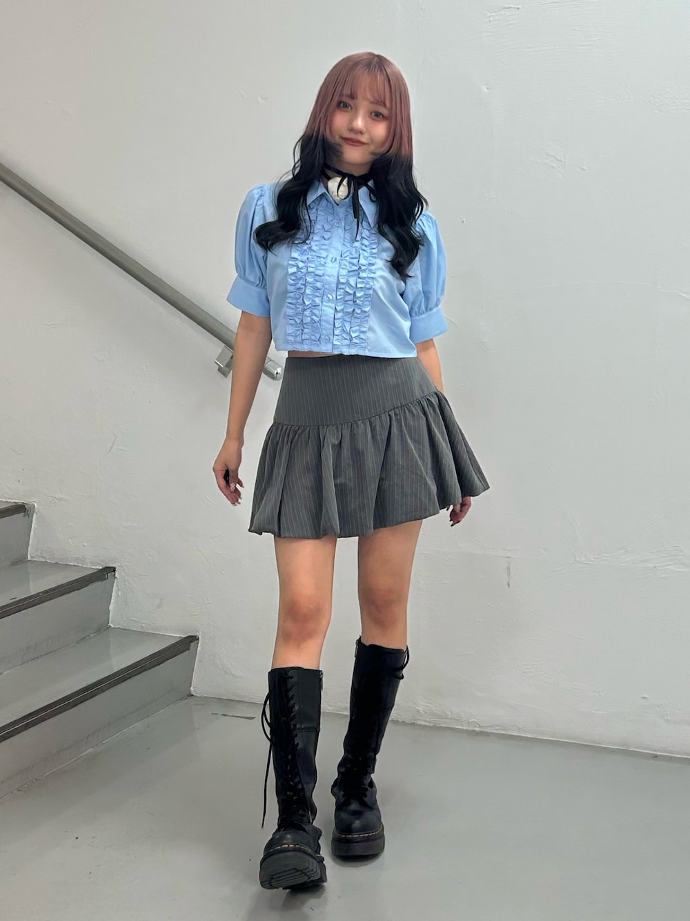 【トップス】フロントのフリルが可愛いシャツはクロップド丈なので脚長効果抜群✨長めのネックレスやネクタイと合わせてあげるのがオススメ🤍前開きなので羽織りで着るのも可愛いです❕ 【スカート】今季流行りのバルーンシルエットがかわいいスカートは中にパンツがついてるので1枚で安心して履いて頂けます💖