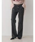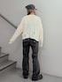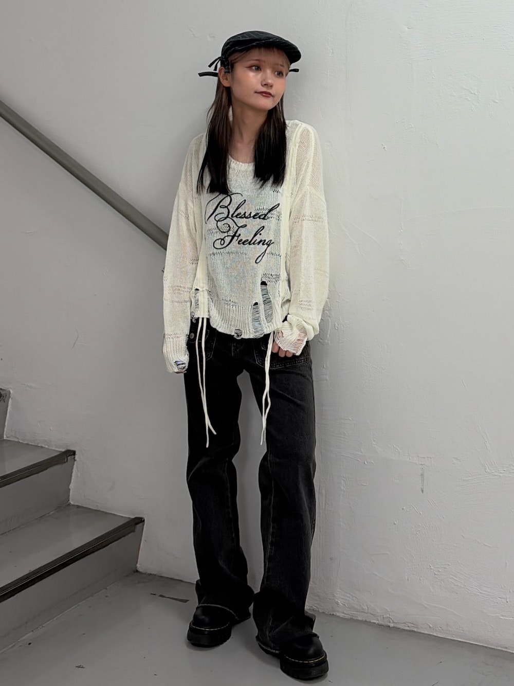 【トップス】自分の好きな長さに調節可能なギャザー付きのニットトップス🩷ダメージ加工がついてるのでそのまま伸ばして着るのもオススメです🫶 【ボトムス】157cmでMサイズ着用!ちょっと緩めに履けちゃいます🙆♀️前後のポケットのデザインがポイント⭐️ストレートの形で足が細く見えます🙆♀️
