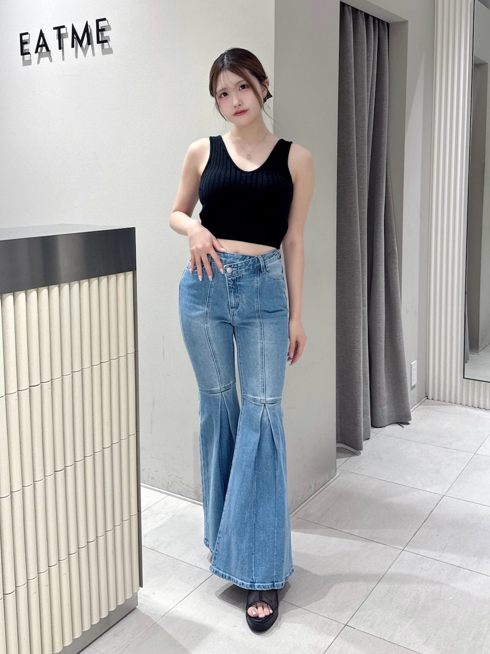 【トップス】 カップ付きで楽ちんなリブニットトップス❤︎シンプルなデザインで着回し力抜群✊🏻シャツやカーディガンを合わせれば秋口まで着用いただけます🤍🍁 【パンツ】 フレアシルエットのデニムパンツ🩶伸縮性のある生地で見た目によらず履き心地抜群🫶🏻フレアの切り替え位置が高く、骨格ストレート優勝な美シルエットです🥰 【シューズ】 夏から秋口まで着用できるシースルーデザインのブーツサンダル🫧バックリボンで大人ガーリーな雰囲気に🎀安定感のあるヒールで疲れにくいです🫶🏻✨️23.5cmでLサイズを着用しております♡