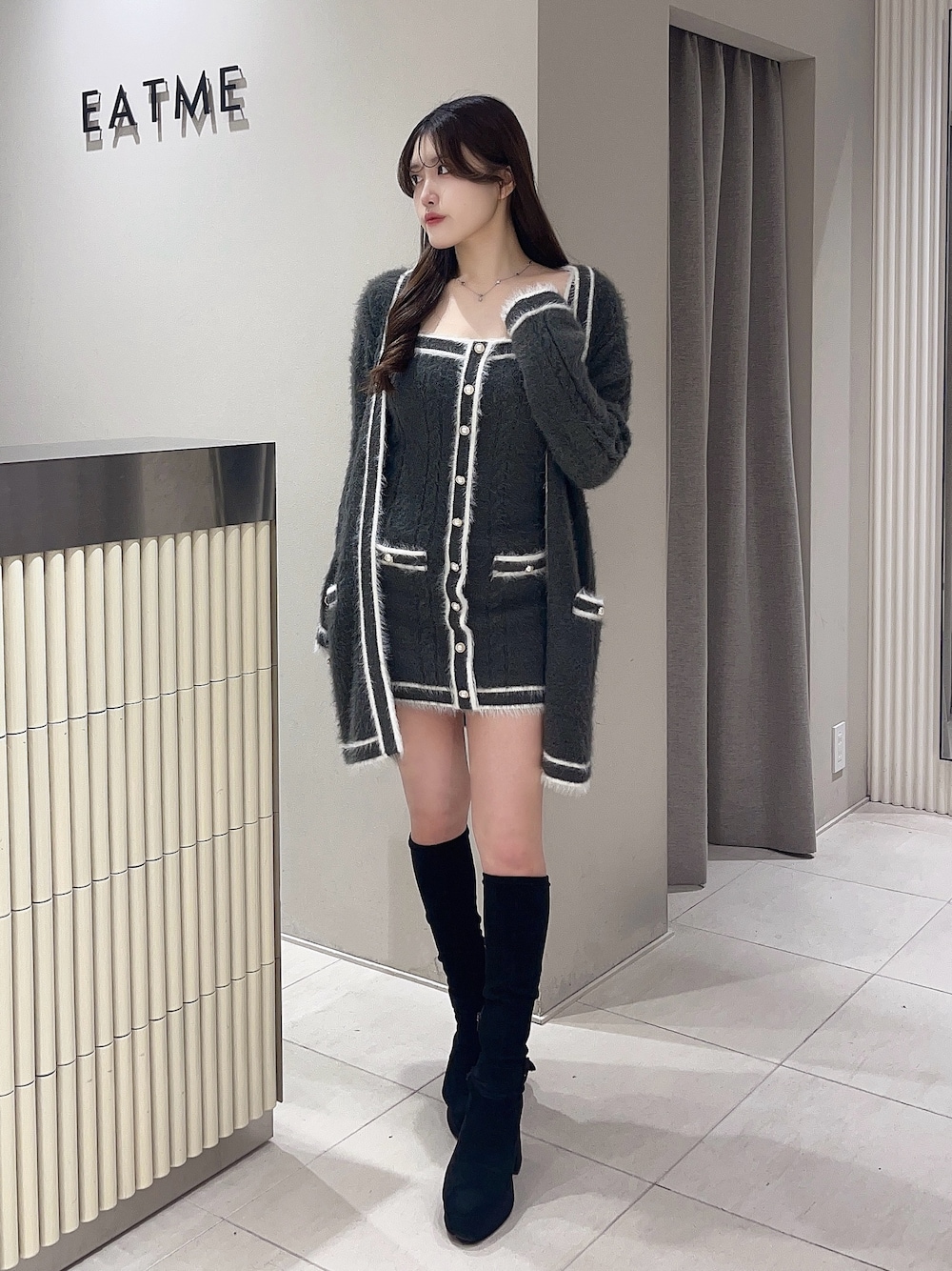 【ワンピース】 カーディガンとセットのキャミワンピース♥毛足の長いシャギーニットで高級感見え🐈⬛✨️自然とくびれができる美シルエットで着痩せが叶います🫶🏻💞デートや女子会にもオススメです♥ 【シューズ】 -5kg見えの大人気ロングブーツ♥前も高さがあり高低差が少なく、安定感があり歩きやすいです🙂↕️✨️ベルトデザインで足首も華 奢見え🫶🏻23.5cmでLサイズを着用しております🎀