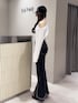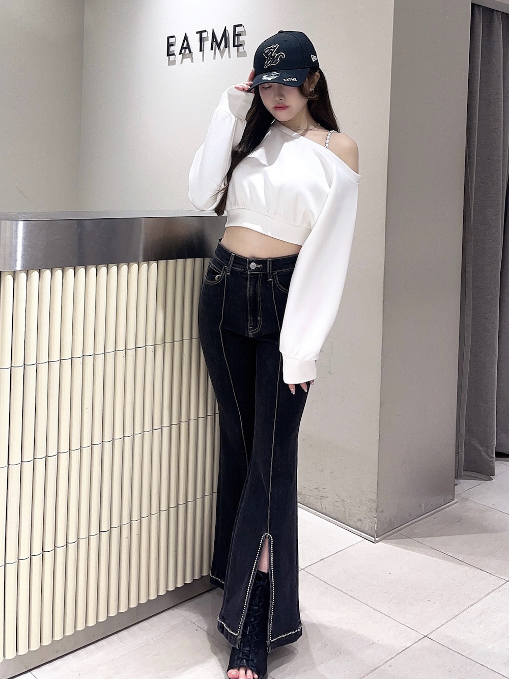 【トップス】ダンボール素材のトップス♥ワンショルデザインでさりげない肌見せが抜け感をプラスし、女性らしさも演出🫶🏻✨️ 【ボトムス】 フレアシルエットのデニムパンツ♡ ビジューデザインで華やかで高級感見えします🫶🏻✨️程よく伸縮性があるのでストレスフリーに着用いただけます🤍 【シューズ】 レースアップデザインのブーツサンダル🎀安定感のあるヒールで疲れにくいです🫶🏻✨️23.5cmでLサイズを着用しております♥