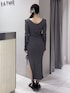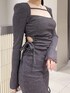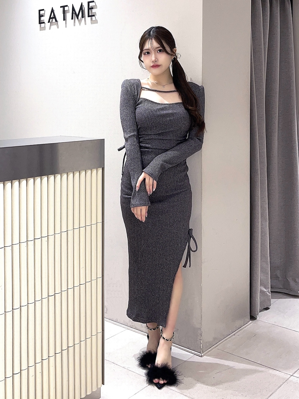 【ワンピース】 リブ素材のワンピース♡カットアウトやスリットのデザインで女性らしい印象に🫧デートやイベントにもオススメです‪·͜· ❤︎‬伸縮性があり着心地が抜群です🙆🏻‍♀️✨️ 【シューズ】 フェザーファーが施されたサンダル♡足首のチェーンストラップが高級感見えします🐈‍⬛✨️足のサイズ23.5cmでLサイズを着用しております🎀