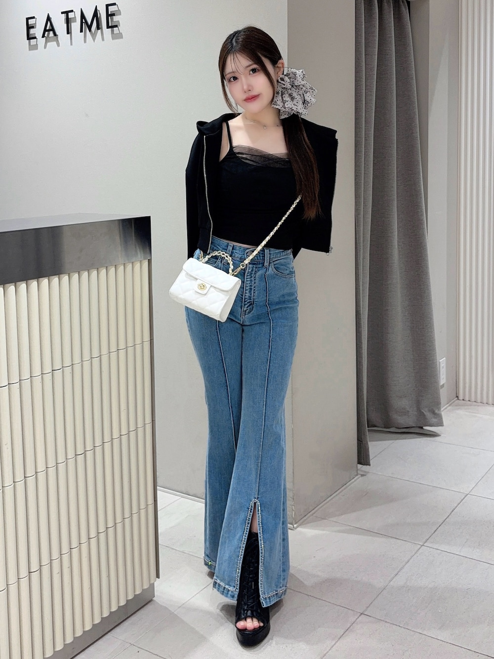 【パーカー】 ダンボール素材のジップパーカー♥ゆったりとしたサイズ感なので、タイトが苦手な方でも着やすいです🫶🏻🫧同素材のセンタープレスワイドパンツとSETUP着用がオススメ🙆🏻♀️✨️ 【トップス】 キャミソールとカーディガンがセットのトップス♡カップ付きなのでそのまま着用ができて楽ちん🫶🏻🫧アジャスターで長さ調節も可能です🙆🏻♀️チュールがコーデに華やかさをプラスしてくれます🌼🤍 【ボトムス】 フレアシルエットのデニムパンツ♡ ビジューデザインで華やかで高級感見えします🫶🏻✨️程よく伸縮性があるのでストレスフリーに着用いただけます🤍 【シューズ】 レースアップデザインのブーツサンダル🎀安定感のあるヒールで疲れにくいです🫶🏻✨️23.5cmでLサイズを着用しております♥