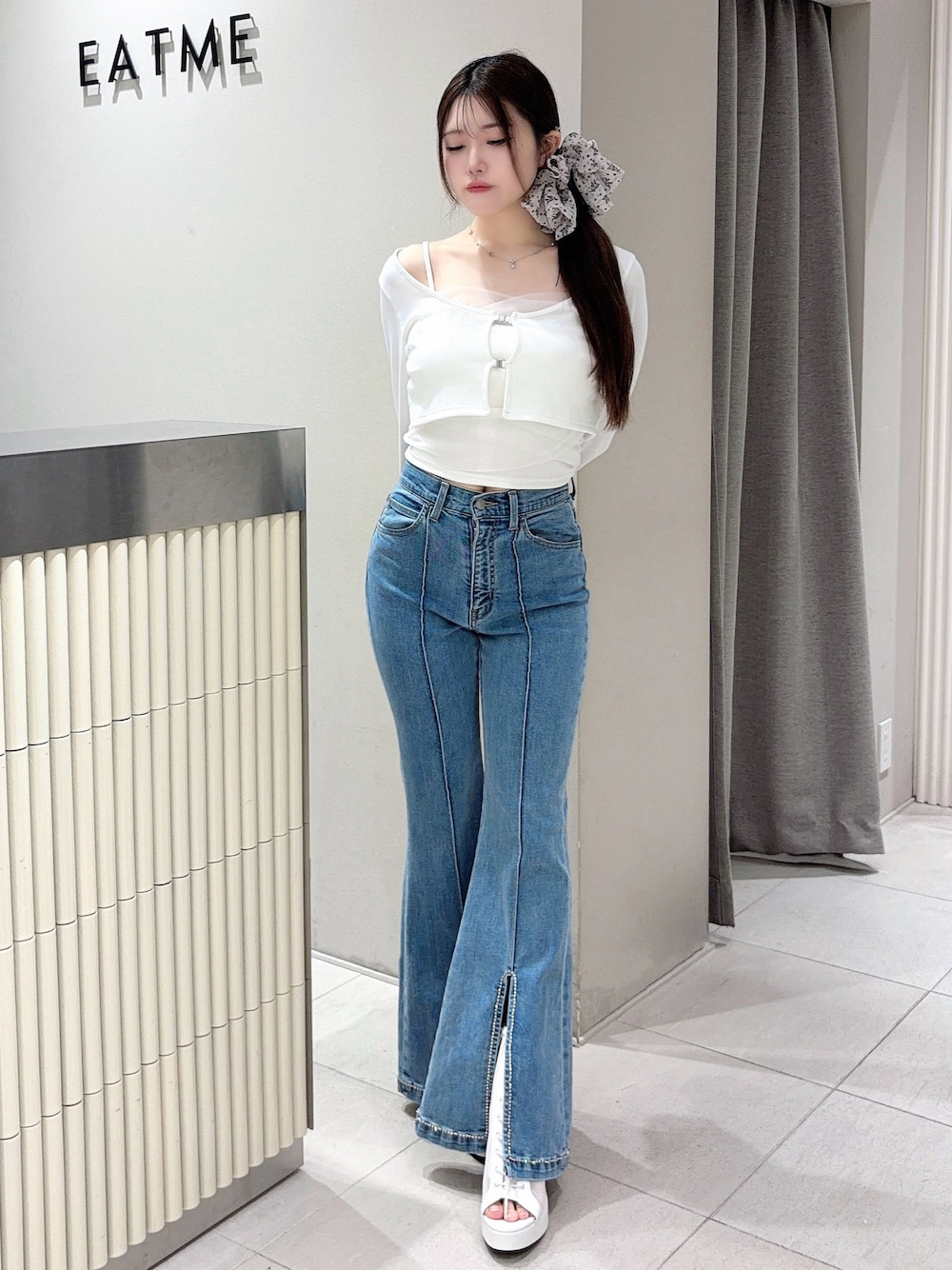 【トップス】 キャミソールとカーディガンがセットのトップス♡カップ付きなのでそのまま着用ができて楽ちん🫶🏻🫧アジャスターで長さ調節も可能です🙆🏻♀️チュールがコーデに華やかさをプラスしてくれます🌼🤍 【ボトムス】 フレアシルエットのデニムパンツ♡ ビジューデザインで華やかで高級感見えします🫶🏻✨️程よく伸縮性があるのでストレスフリーに着用いただけます🤍 【シューズ】 レースアップデザインのブーツサンダル🎀安定感のあるヒールで疲れにくいです🫶🏻✨️23.5cmでLサイズを着用しております♥