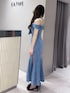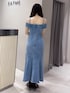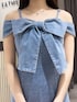【ワンピース】 オフショルデザインのワンピース♡デニムライクなスウェット素材なので、着心地抜群🫧🤍フロントの大きめリボンがデザインポイント🎀程良くタイトでスタイルアップが叶います🫶🏻✨️ 【シューズ】 フェザーファーが施されたサンダル♡足首のチェーンストラップが高級感見えします🐈⬛✨️足のサイズ23.5cmでLサイズを着用しております🎀