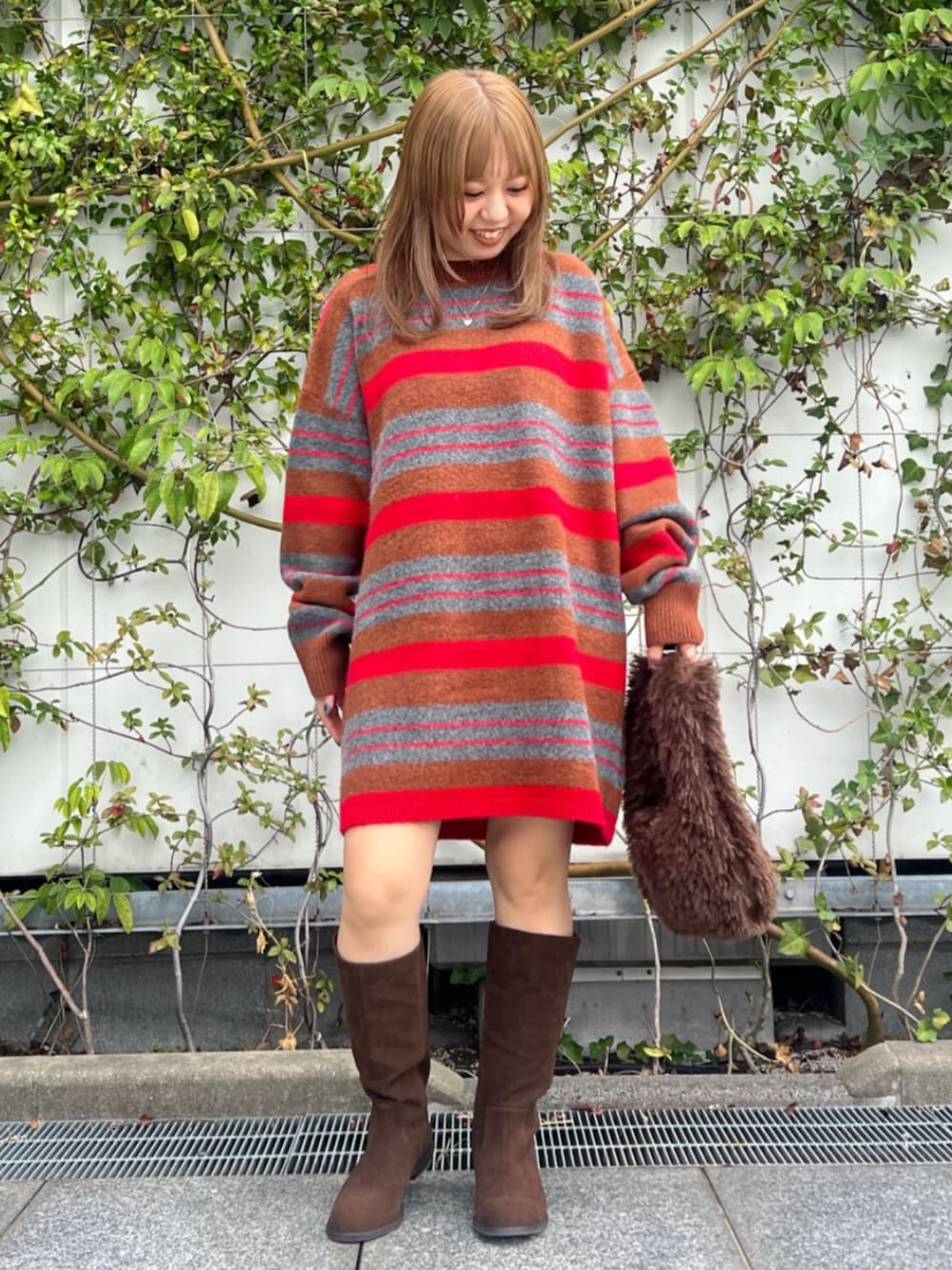 【ニット】 155cmで膝上の着丈です😌 小柄さんは一枚でミニワンピ風に着ていただけます✨ ゆったりしたサイズ感なので、ラインを拾わず着られます🙆♀️ 【ブーツ】 普段24.5cmでLサイズ着用。 ローヒールなので、一日中履いても疲れにくいです✨ 【バッグ】 毛足の長いファーで持つだけで季節感の出るアイテムです🤎