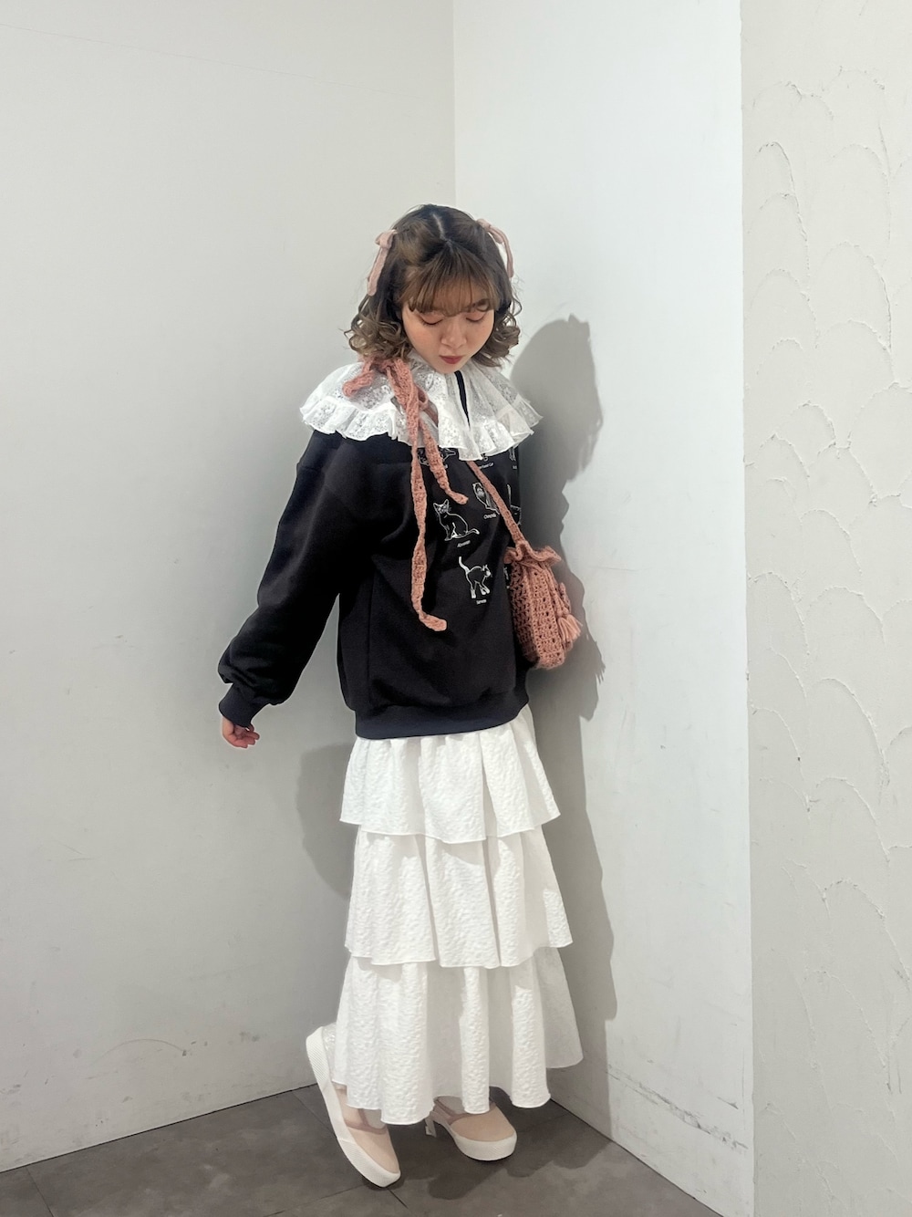 【カジュアルピンクさしいろコーデ🎀】 毎回大人気の猫図鑑スウェット🐱 オーバーサイズでゆるっと感があり3色展開なので、お好みのスタイルでお選び頂けます! 私は1番大人っぽく着られるチャコールグレーに甘さを足したくてケープブラウスを❣️ こちらは襟が名前の通りケープになっており、360°可愛いアイテムになってます♡ merryならではのデザインで、レイヤードにもおすすめです! スカートはシンプルなティアードに見えますが実はお花柄❁ 総ゴムなので低身長の方も丈感やウエスト気にせず、着用していただけます! 小物はピンクを差し色に💗 ポシェットは紐で長さ調節可能で、 ニットの中に裏地つきです! シューズはヒールなしでとっても歩きやすく、グリッターが可愛いアイテム♡ 私は23.5cmでMサイズ着用しております!