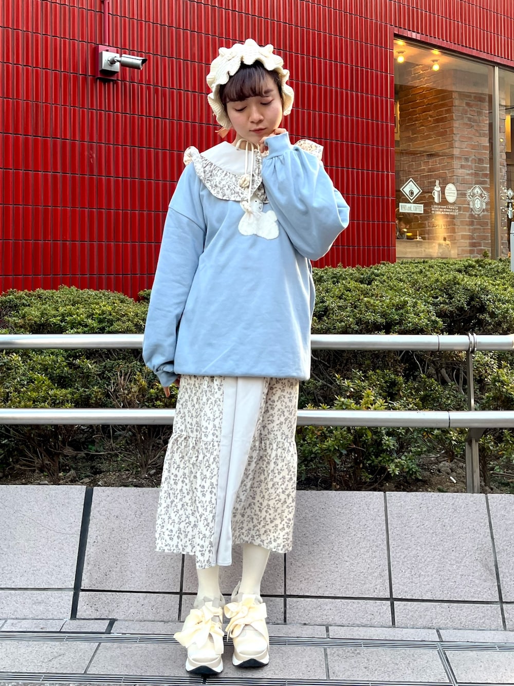 ″ヘッドドレスでとことんガーリーな春コーデ🌸″ ワンピースは春らしいお花柄❁ 1枚はもちろん私みたいにスウェットをレイヤードすると映える大きい襟がポイントです! 私は154cmでくるぶし位の丈感です! レイヤードしたスウェットは、求心フレンズとのコラボアイテム🐰 胸元のうさぎちゃんがポイントです! ゆったりした作りになっていて、丈感はおしりがしっかり隠れるサイズです❣️ そしてmerry初のヘッドドレス。 ニット編みになっていて、お花のポイントが付いてます🌼 編んでることによって透け感があるので、 ヘッドドレス初心者の方にもオススメです! スニーカーは人気のリボンスニーカー⑅⃛ 靴紐は無いのでスポッとそのまま気軽に可愛く履いていただけるのがポイント! 私は23.5cmでSサイズを着用しております!(少し大きい作りなので、いつもよりワンサイズ小さいものを履いてます!)