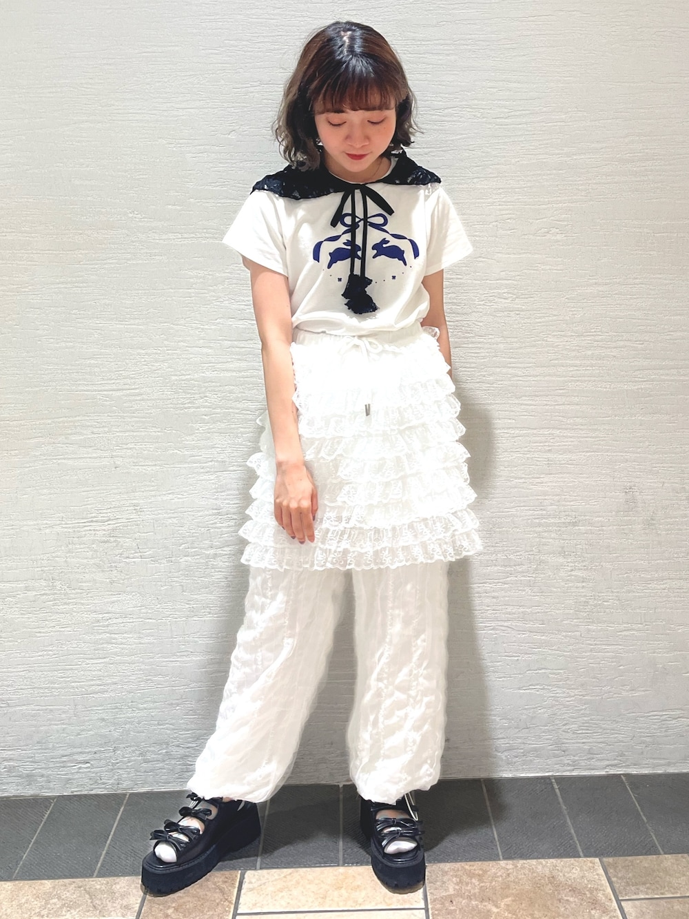 ❁トップス ポコっと飛び出たうさちゃんプリントが可愛いTシャツ🐰 フィット感がある着心地で、1枚でももちろん、キャミワンピースなどと重ねていただくのにもピッタリなアイテムです! ❁スカート たくさんのレースが重なったミニスカート。1枚でもパンツなどとレイヤードしてトレンド感を出しても可愛いですよ! 私は154cmで膝上位の丈感です♥ ❁パンツ トレンドのパラシュートパンツをmerry jennyらしくチュールで仕上がった1枚。 裾が絞れるので低身長さんでも丈感気にせず着用頂けます! ホワイトのカラーは透け感があるので、ペチコートなどを履くと気にせず着用頂けますよ! ❁ボンネット 総レースのボンネット♡ フードにしていただいても、被らず肩にかけてつけ襟みたいにして頂いてもワンポイントで可愛いです! ❁シューズ リボンがたくさんの厚底サンダル🎀 しっかり厚底ですが、安定感抜群で歩きやすいです! 私は23.5cmでMサイズを履いてますが、後ろに調整ベルトもあるのも安心です!