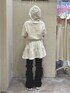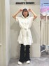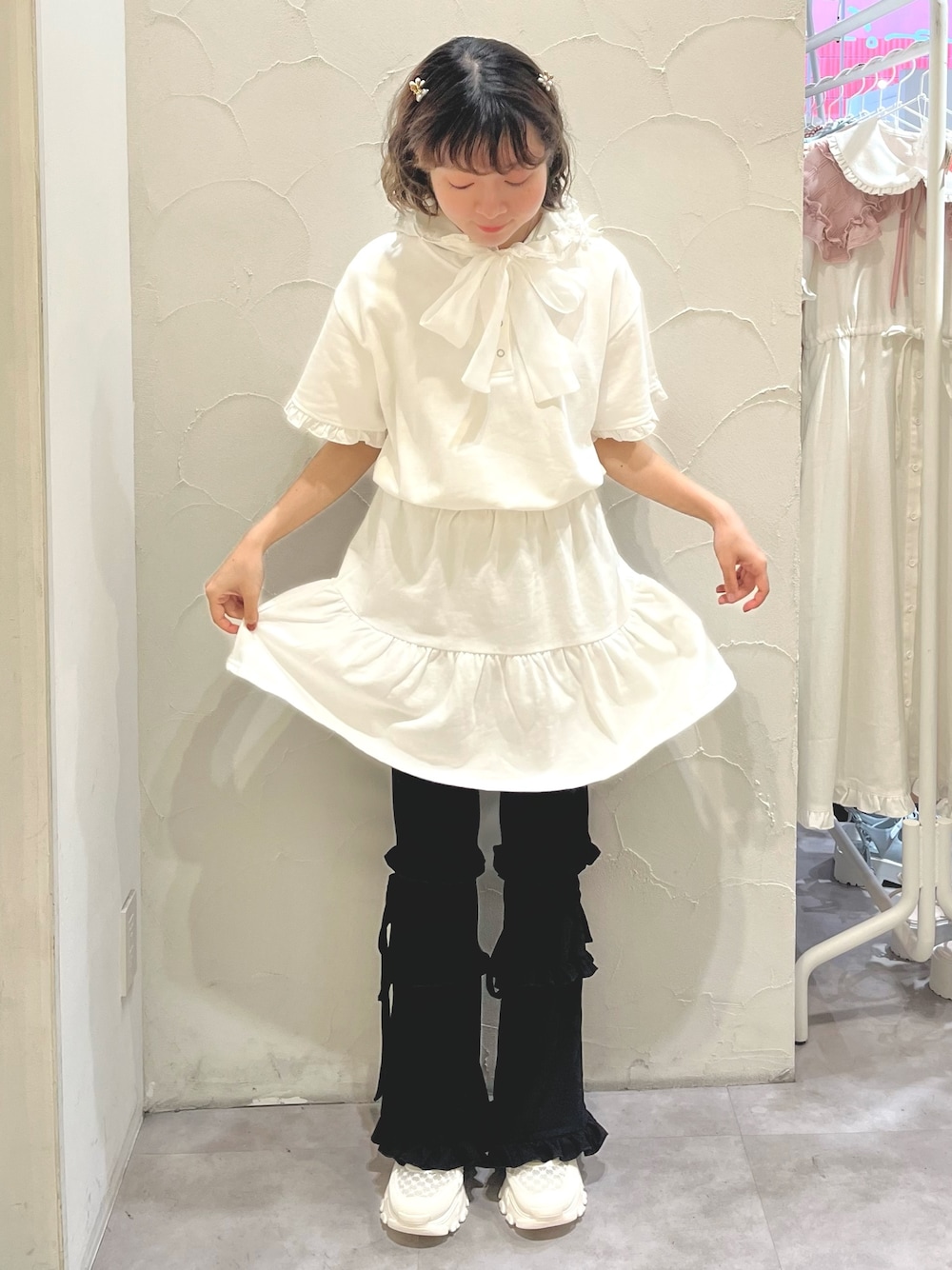 ❁ワンピース フード付きのミニワンピース! フードには小さなりぼんが施されていて、被ってもワンポイントに🎀 ウエストのゴムがスタイルアップ効果もバツグンです! 私は154cmで膝少し上くらいの丈感です。 ❁ボトムス フリルリブのパンツは、ゆったりした素材感ながら足元のリボンを結ぶことでメリハリ感があります! レッグウォーマーモチーフで、裾が広がるお作りなのでふくらはぎもスッキリ見せることができますよ! ❁シューズ メッシュ生地も入った涼し気なスニーカー!リボンもあしらわれておりとてもガーリーなテイストです🤍 私は23.5cmでMサイズを着用してます。少し大きめのお作りにも関わらず、 前と後ろ両方調整出来るので、安定感があります!