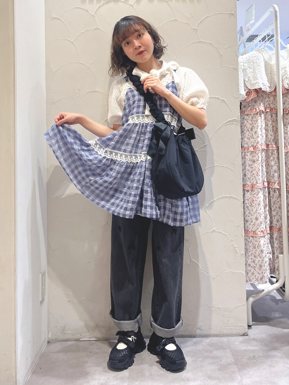 ❁ブラウス 襟のダブルのリボンがポイントです! 他の部分がとてもシンプルなので、1枚でもワンピース等とレイヤードして頂いても相性バツグンだと思います! 生地が夏らしい通気性ある素材なので、着心地もバツグンです! ❁チュニック トレンドのランジェリーライクをmerry jennyらしいスタイルで♡ アジャスター付きなので丈感調節可能です! 低身長さんから高身長さんまで楽しんで頂けるアイテムだと思います! ❁ボトムス 小さなリボンが沢山のデニムパンツ🎀 お膝あたりまでたくさんなので、長めの丈のトップスやチュニックと合わせても可愛く見せられます! 私は154cmで足首ピッタリくらいの丈感です! ❁バック 斜めがけのショルダーバック。 リボンもついててガーリーさもありながら、くしゅくしゅっとした素材がカジュアルさもあり、色んな系統のお洋服に合わせて頂けると思います♡ ❁シューズ メッシュ生地も入った涼し気なスニーカー!リボンもあしらわれておりとてもガーリーなテイストです🤍 私は23.5cmでMサイズを着用してます。少し大きめのお作りにも関わらず、 前と後ろ両方調整出来るので、安定感があります!