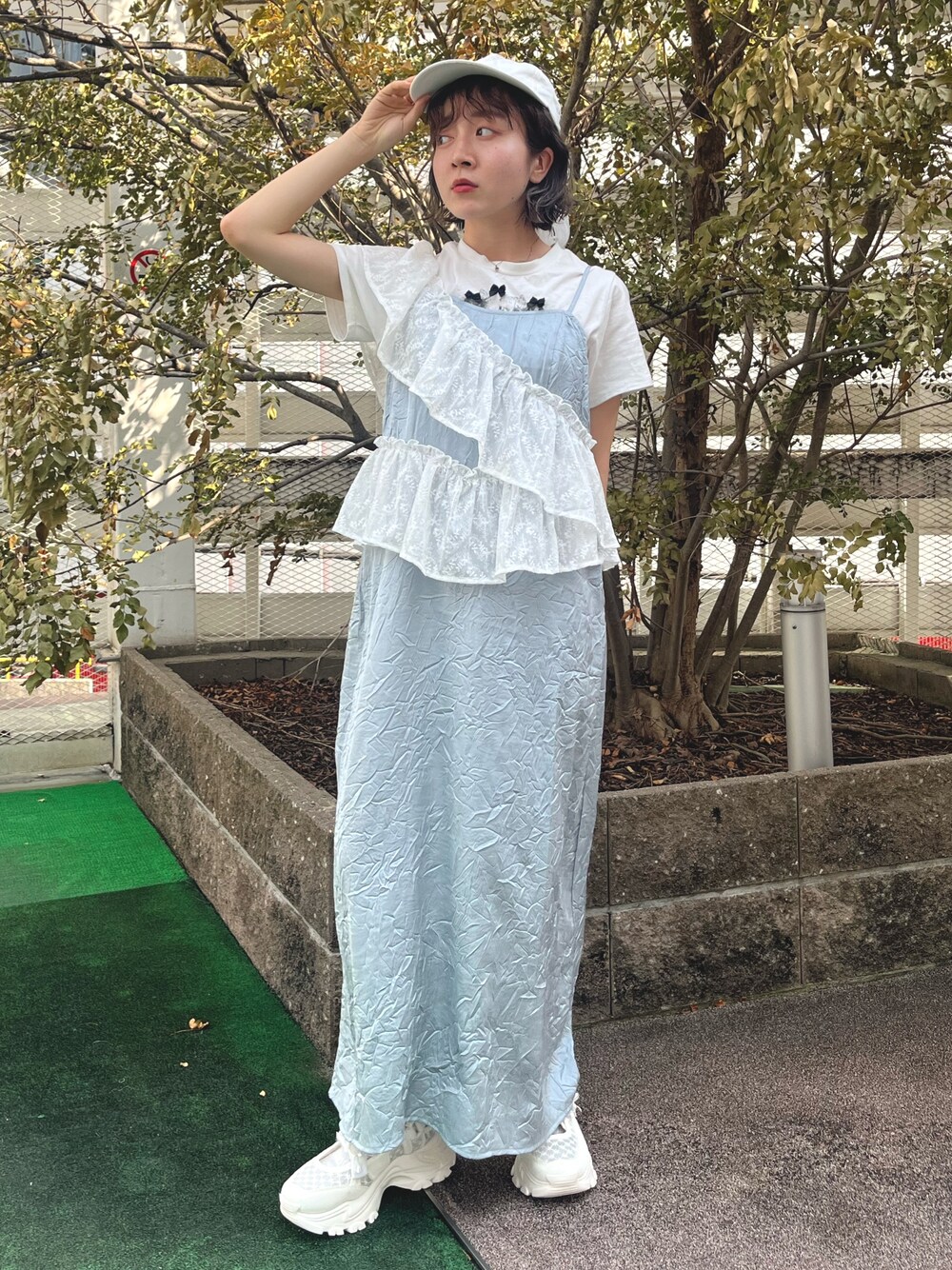❁インナー リボンをつけた猫ちゃんの可愛いTシャツ 大きすぎないサイズ感で1枚でもキャミワンピの中にもピッタリです! キャミワンピの中でもプリントが隠れないように上の方に施されたのもポイントです❣️ ❁ワンピース サテン素材のキャミワンピース。 肩のレースがトレンドのサッシュデザインになっていて、上げたり下げたりで着こなしを楽しんで頂けます! スッキリとしたシルエットで、丈感は154cmの私で足首くらいです。 アジャスターで調整可能です! ❁キャップ 後ろの大きめチュールリボンがポイントのキャップ。つば部分などもチュールで覆われておりガーリーな仕上がりです。 後ろのベルトでサイズ調整可能です! ❁シューズ メッシュ生地も入った涼し気なスニーカー!リボンもあしらわれておりとてもガーリーなテイストです🤍 私は23.5cmでMサイズを着用してます。少し大きめのお作りにも関わらず、 前と後ろ両方調整出来るので、安定感があります!