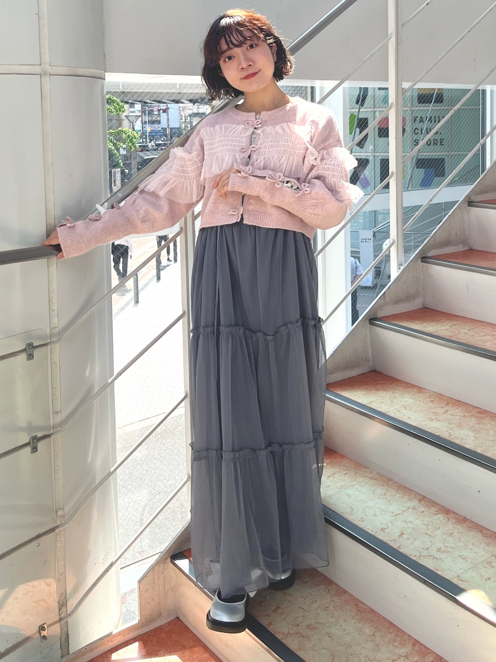 ❁インナー 小花柄プリントのスッキリピタッと感あるレース生地トップス。 シルエットはピタッとしながらも、締め付け感はなく着心地抜群です! 1枚でももちろんキャミワンピやビックTとのレイヤードスタイルもおすすめです! ❁カーディガン チュールとリボンがガーリーなカーディガン♡ コンパクトなお作りで、ショート丈なことでスタイルアップ効果も。 お袖もキュッとで細見え効果も抜群です! ❁ワンピース チュールがふわふわのキャミワンピース💭 胸下のリボンでドロスト感を調整出来るのが◎ またアジャスターで丈感も調整して頂けます!私は154cmで短くして足首上位の長さでした! ❁シューズ merry jenny定番のラバーシューズが復刻!S.M.L展開で幅広いサイズ展開も嬉しいポイントです!かっちりしながらラバー部分で安定感と歩きやすさがあります! 私は23.5cm幅狭めでSがジャストサイズ、靴下の事を考えてMサイズを着用しております!