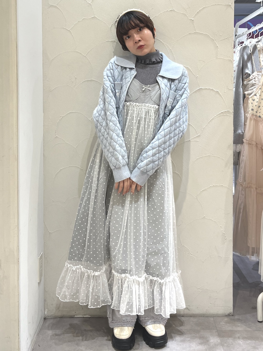 ❁インナー 冬の定番のリブニットにフリルがついたガーリーな1枚。1枚でももちろんワンピースやトップスとレイヤードしても◎ 4色展開でお洋服の差し色にも! ❁カーディガン ストーンウォッシュ加工でトレンドのヴィンテージ感も◎ 丈感短めでスタイルアップも! 厚手なキルティング生地で冬でも暖かく着用頂けます! ❁ワンピース コルセット風のキャミワンピース。 胸元がコルセット風に、胸下で切り替えがあるためスタイルアップ効果も◎ チュール部分はドット柄に見えて、実はお花柄なのもツボポイント! アジャスターで調整可能で、154cmの私で足首の丈感です! ❁パンツ merry jennyの定番のレースフレアパンツにりぼんが付いてさらに可愛くなりました♥154cmの私で引きずらない丈感です! ウエスト折って着用も頂けるので安心だと思います! ❁シューズ コロッとした丸みある形が可愛い厚底ローファー。ヒールがしっかり7cmもあるので足もスッキリ見せながら、中綿が入っているので歩きやすいアイテムです! 私は23.5cmでMサイズを着用しております。