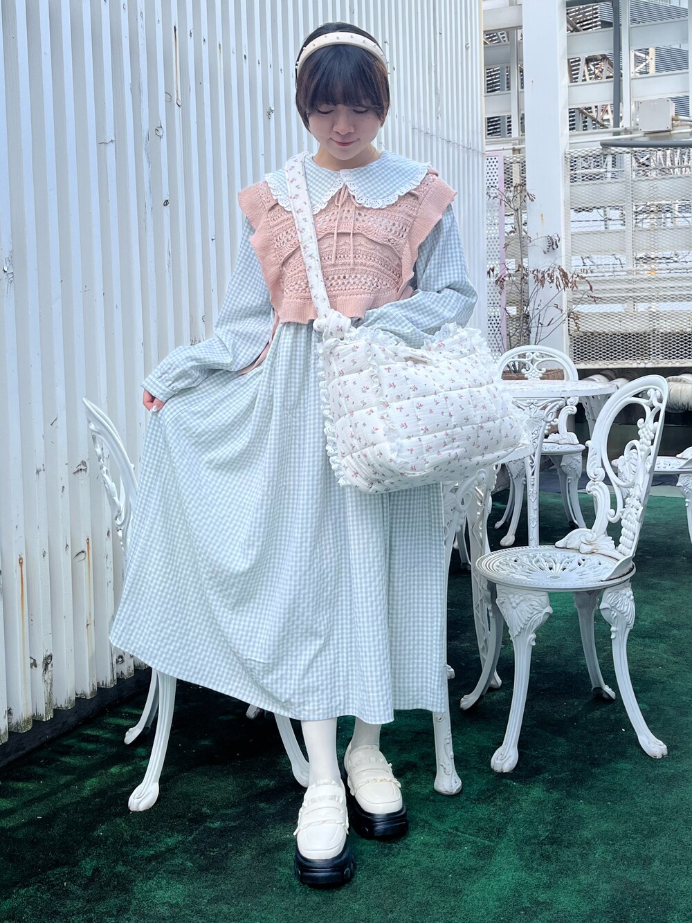 ❁ワンピース merry jenny定番の襟付きワンピースが今年はギンガムチェックで登場しました! ウエストマークでスタイルアップ効果も◎ 私は154cmで足首見える丈感です。 ❁ベスト フードが付きのトップスで、つけ襟感覚でプラスワンしてお持ちのアイテムをさらに可愛くしていただけます!サイドのリボンで調整できます。今の時期ならスウェットのような厚手素材に、夏はTシャツなどにレイヤードして頂いても◎ ❁バック 小花柄とレースがガーリーな斜めがけキルトバッグ。ショルダー部分は調整可能で肩掛けバッグとしても◎! マチもしっかりで、A4サイズ横向きすっぽり入るサイズなので通勤通学にもピッタリです! ❁シューズ コロッとした丸みある形が可愛い厚底ローファー。ヒールがしっかり7cmもあるので足もスッキリ見せながら、中綿が入っているので歩きやすいアイテムです! 私は23.5cmでMサイズを着用しております。