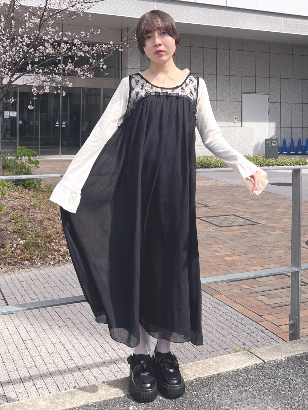 ❁トップス デコルテを見せてくれるのでお顔周りスッキリと。そしてショート丈がトレンド感とスタイルアップ効果も◎ ❁ワンピース レースやシアー感のある春らしいワンピース。 インナー次第で夏まで心地よく着用頂けます! 私は154cmで足首見える丈感でした! 軽やか素材で動くと揺れるシルエットも可愛いアイテムです! ❁シューズ お花のポイントが印象的な厚底シューズ。 クッション性がしっかりなので、疲れにくくむしろふかふかで快適です! 私は23.5cmでMサイズを着用してます! ベルトで調整も可能でホールド力抜群です!