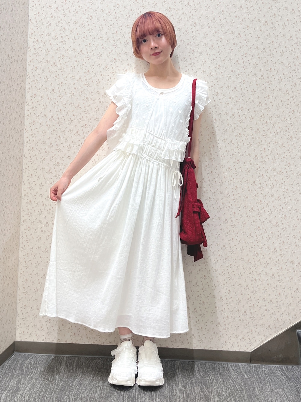 ❁ワンピース 軽やかな素材のシンプルワンピース。 シンプルながらも、リボンやギャザーなど可愛さ詰まった1枚! 154cmの私で足首見える丈感です! ❁つけ襟 キラキラスパンコールがついたベストタイプのつけ襟。Tシャツだけでなく、ブラウスやスウェット、ワンピースにプラスするだけで一気に華やかにしてくれます✨ ❁バッグ リボン×レースの巾着型トートバッグ🎀 絞りを緩めるとA4サイズも入るトート型に、絞って頂くとコンパクトに。 場面によって変えて頂く事ができます! ❁シューズ チュールたっぷりの厚底スニーカー。 シューレースが2種類付いているので、お好みのスタイリングで変えていただけます♡ 私は154cm甲低めでMサイズをゆったり着用しております!
