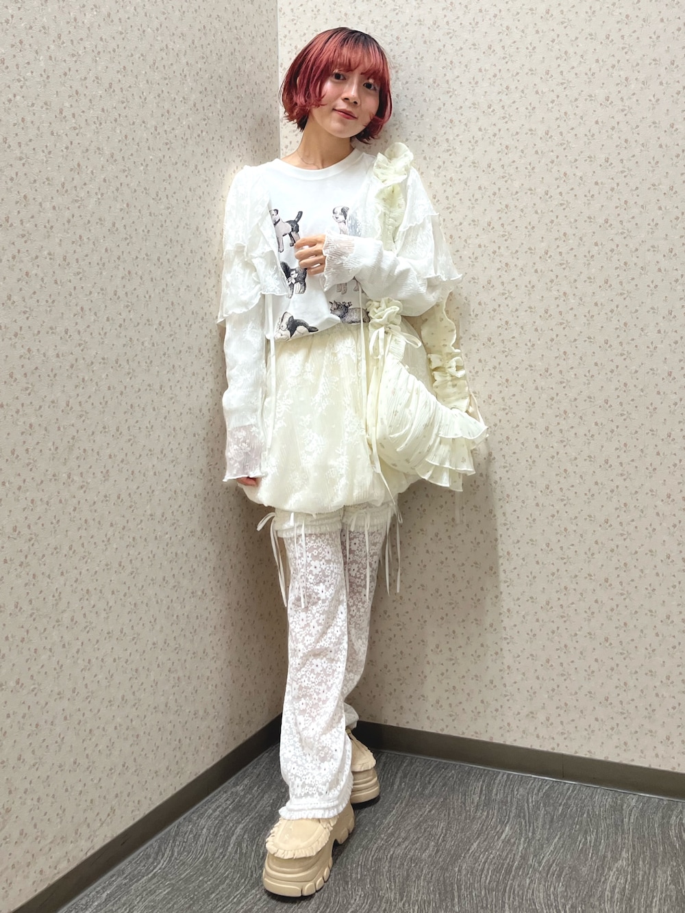 ❁トップス わんちゃんのぬいぐるみがたくさんの長袖Tシャツ。思わずクスッとなってしまうような6種類の愛らしいわんちゃんたちです! ゆったりサイズで154cmの私でおしりが隠れる&お袖の長さは手の甲にかかるサイズ感です ❁ボレロ 今からの時期にピッタリな軽い素材感のボレロ。ショート丈&ノーカラーでお持ちのどんなアイテムとも相性良く着こなせちゃいます! ❁スカート 軽やかなレースが重なったバルーンスカート。 生地感重すぎず、また総ゴムで着心地抜群です!私は154cmで太もも真ん中上くらいの丈感でした🌷パンツとのレイヤードもオススメです! ❁パンツ レース感あるボトムスはロングでもショート丈でも使える2wayタイプです。 レースパンツとしてミニの下に履くのはもちろん、ショート丈のバイカーパンツとしても着用頂けます!私は154cmでおらずにピッタリの丈感でした! ❁バッグ カジュアルになりがちなボディバッグもmerry jennyらしく小花柄にリボンでかわいく! チャックにもリボンが付いてるのが私的おすすめポイントです! 肩紐ドロストで調整可能などで肩掛けなどにも変更◎!折りたたみの日傘なども入るサイズ感です! ❁シューズ スエード素材が秋先取りな厚底シューズ。 しっかり厚底で身長を盛ってくれるので、ミニ丈とも相性ばつぐんです! 私は23.5cmでMサイズがジャストサイズでした!
