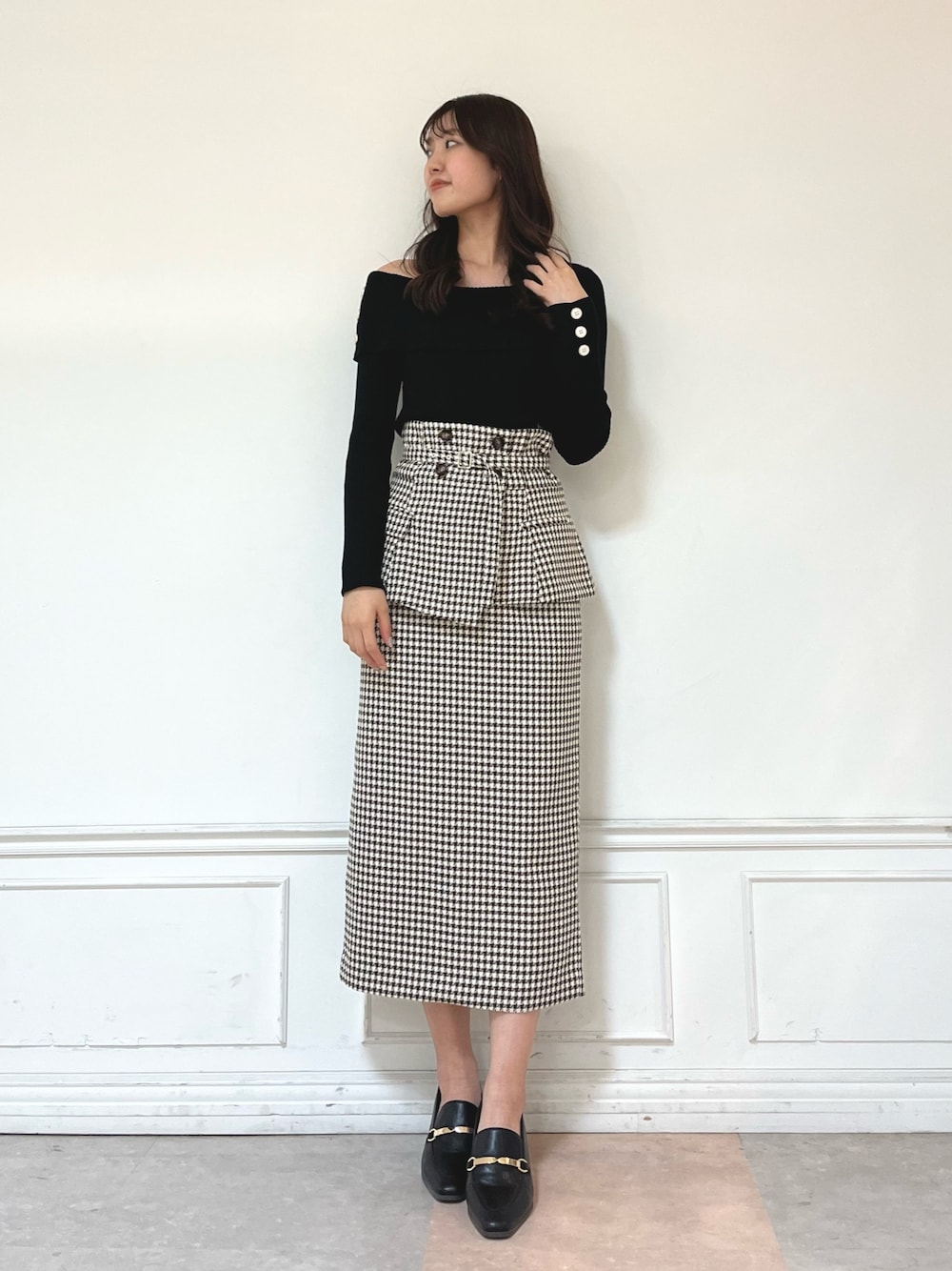 大人コーデ🥂🖤 〈トップス〉 ワンショルダーで女性らしいシルエットになっています♡ デコルテを見せることで大人っぽい印象に✨ 〈スカート〉 Iラインのスカートですがペプラムデザインになっていて骨盤気になる方も着やすいです🙆🏻♀️ ̖́- ベルト付きでウエスト調整可能です!! 〈シューズ〉 普段23.5~24.0cmでLサイズ着用です!!
