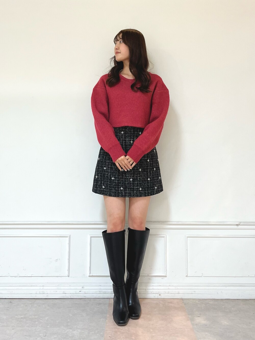 クリスマスコーデ🎄❤️ 〈トップス〉 ショート丈なのでハイウエストのスカート、パンツと相性抜群◎ 後ろはさりげなく肌見せもできて大人可愛いデザインになってます🥺🫶🏻 〈スカート〉 ラメのツイードにビジューもついてキラキラ🌟 インナーパンツになっているので安心して履けます!! 〈シューズ〉 普段23.5~24.0cmでLサイズ着用です!!