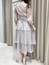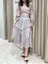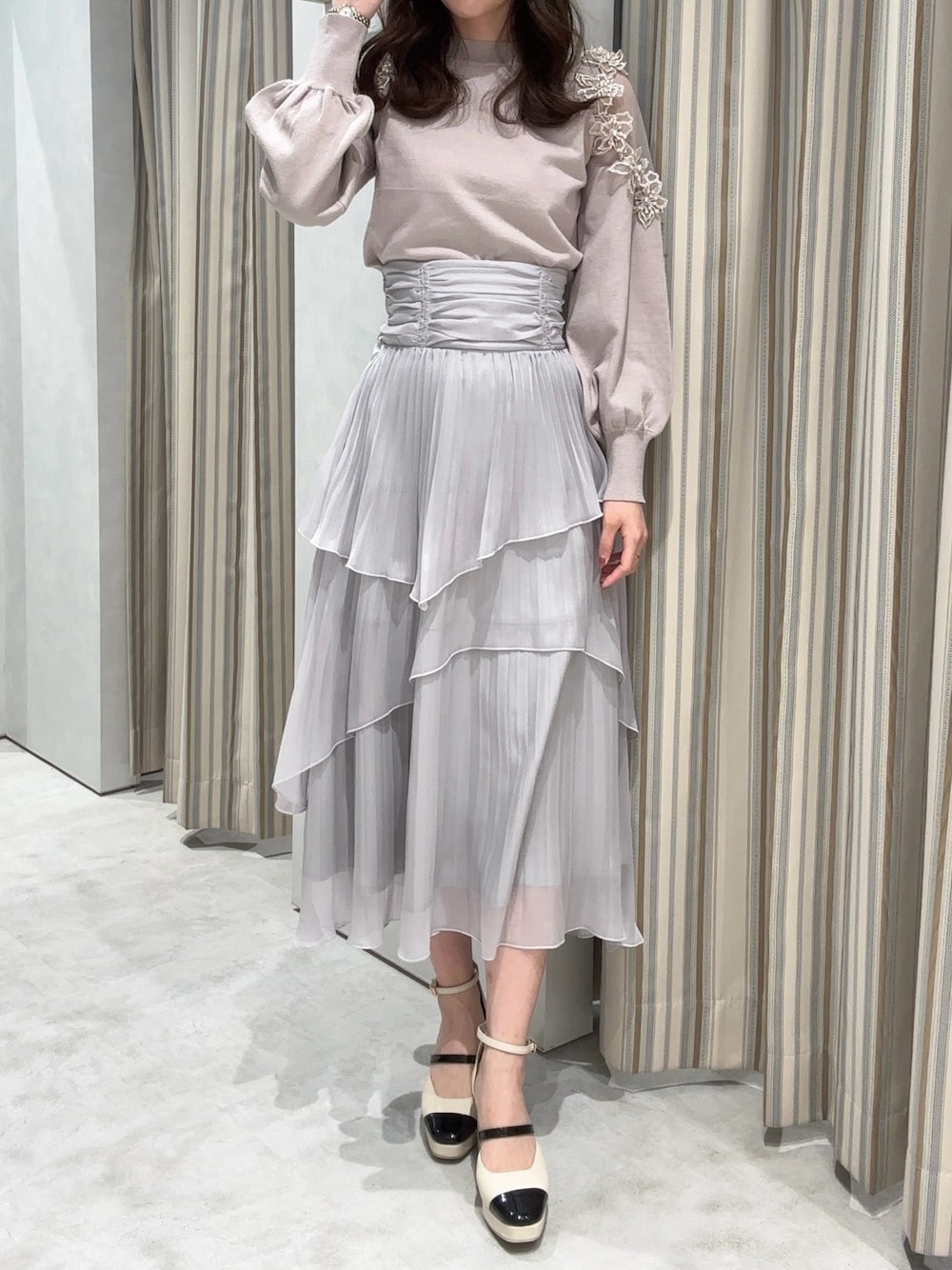 軽めのニット素材で春らしく着ていただけます!!立体感のあるお花のモチーフは存在感を演出してくれます🌸 スカートはティアードになっており適度なボリューム感をだしてくれます🫶🏻細かいプリーツや後ろのリボンで大人可愛く着れます!!!ウエストの切り替えもしっかりあるので細見え間違いなしです👏🏻💕︎︎