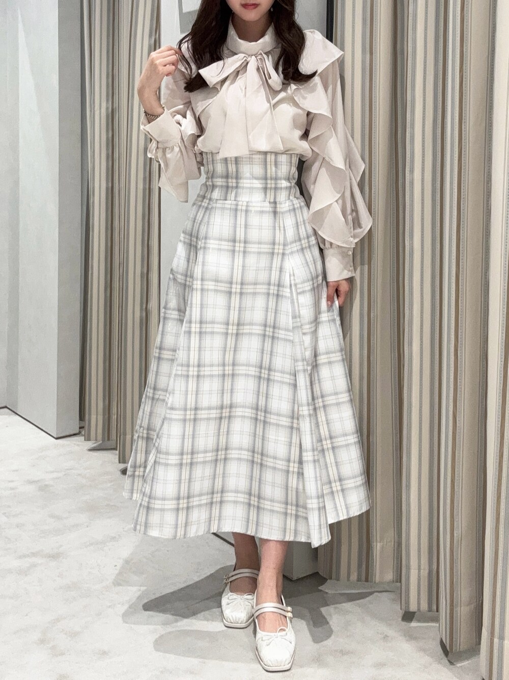 トップスは春らしいリボンブラウス🎀リボンは取り外し可能なので気分によって変えれます!!大きなフリルがついているので可愛らしい印象に♡気になる肩幅や二の腕もカバーしてくれます👍🏻 ̖́- スカートはdazzlinの王道のコルセットスカート♡後ろのレースアップでウエスト調整できます!!サイズはXS.S.M展開なのでお好みの丈感、サイズ感で着ていただけます🥰