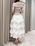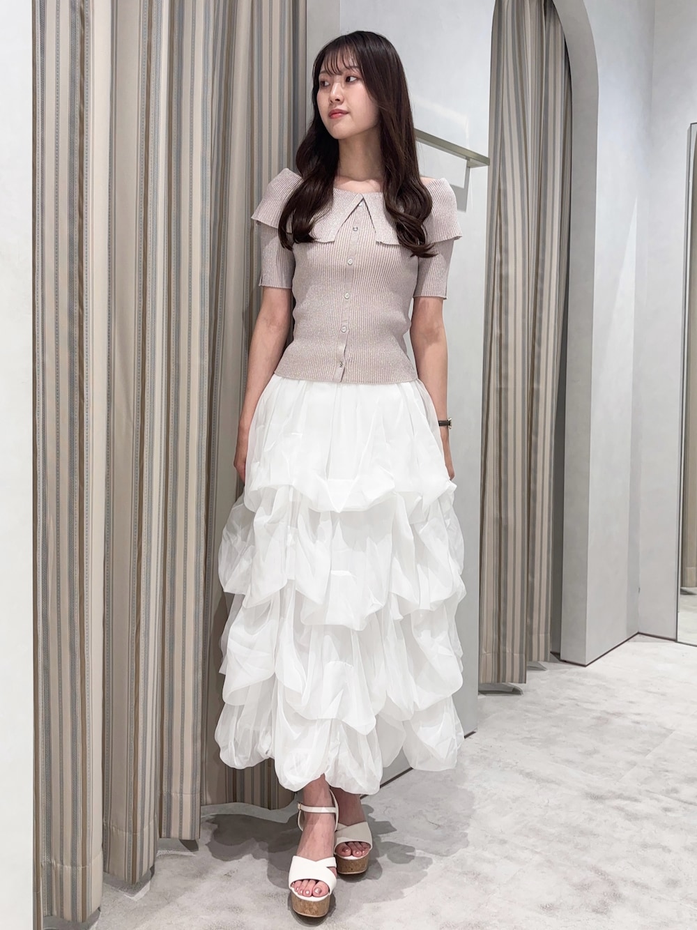 トップスはラメ感のあるキレイめニットです✨デコルテがキレイに見えて大人っぽさアップです.ᐟ.ᐟインでもアウトでも着ていただけます💯◎ スカートはシアー素材を使用しているので軽く涼しげな印象に🎐🩵程よいボリューム感がありふんわり感が可愛いです♡