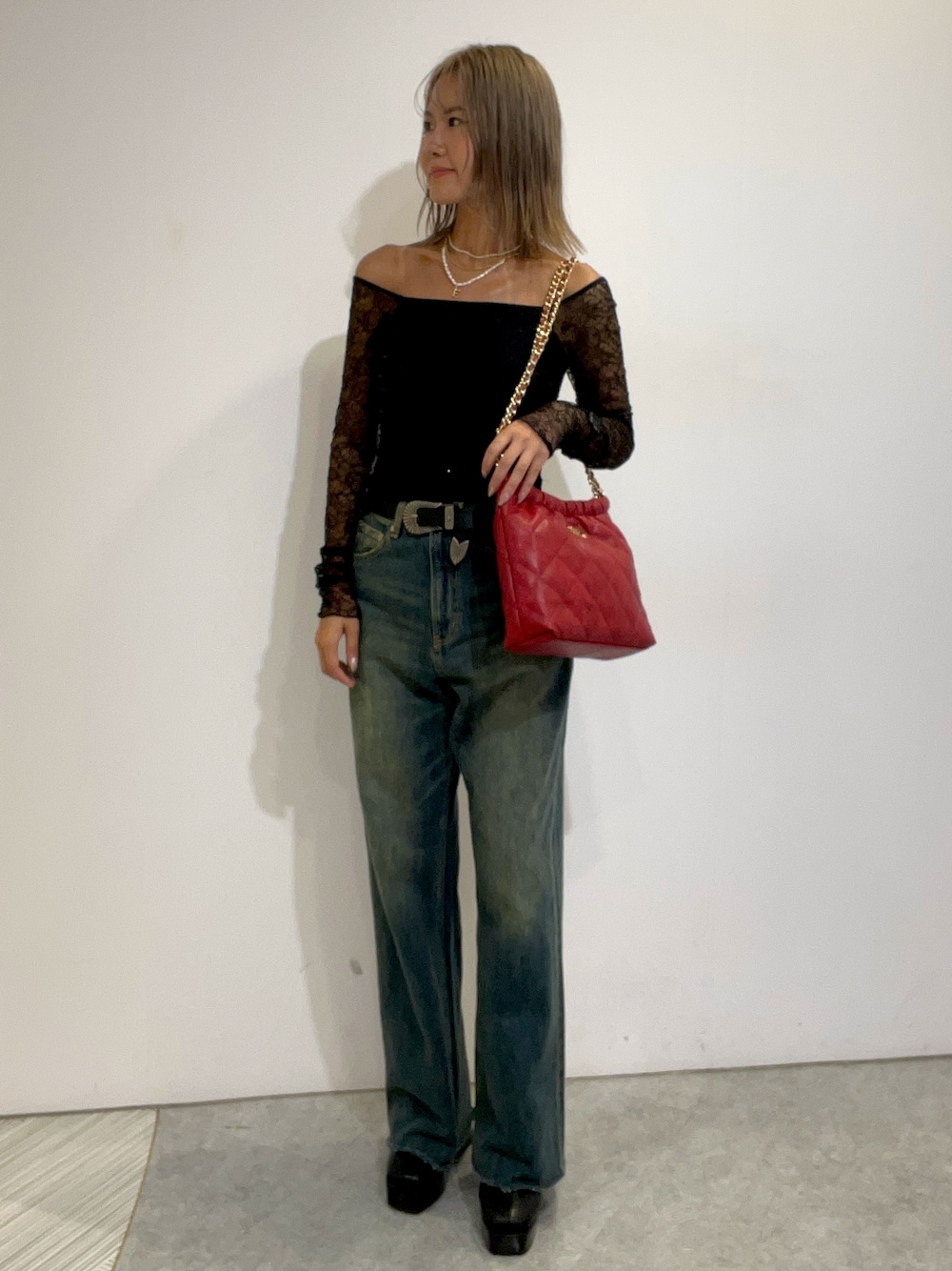 ❤︎大人綺麗めコーデ❤︎ 【トップス】 レースが旬なシアートップス💖 中にパット付きで1枚で着用可能です! 背中がオーバーに空いていてバックライン綺麗に見えます! 【ボトムス】 EVRISで大人気の形が綺麗すぎるデニムです! ダメージが入ってないのでどんなコーデにも取り入れやすいです🫢 162cmSサイズで足の甲に付くぐらいの丈感です◎ 【シューズ】 つま先が尖っていないデザインで履きやすいデザインになります🙂↕️ 柔らかい合皮のデザインなので足元疲れにくいです🙂 普段24.5cmLサイズ着用です! 【バッグ】 キルティングが秋冬ぴったり大人の雰囲気でお持ち頂けます! 500mlのペットボトルも余裕で入る大きさです😌