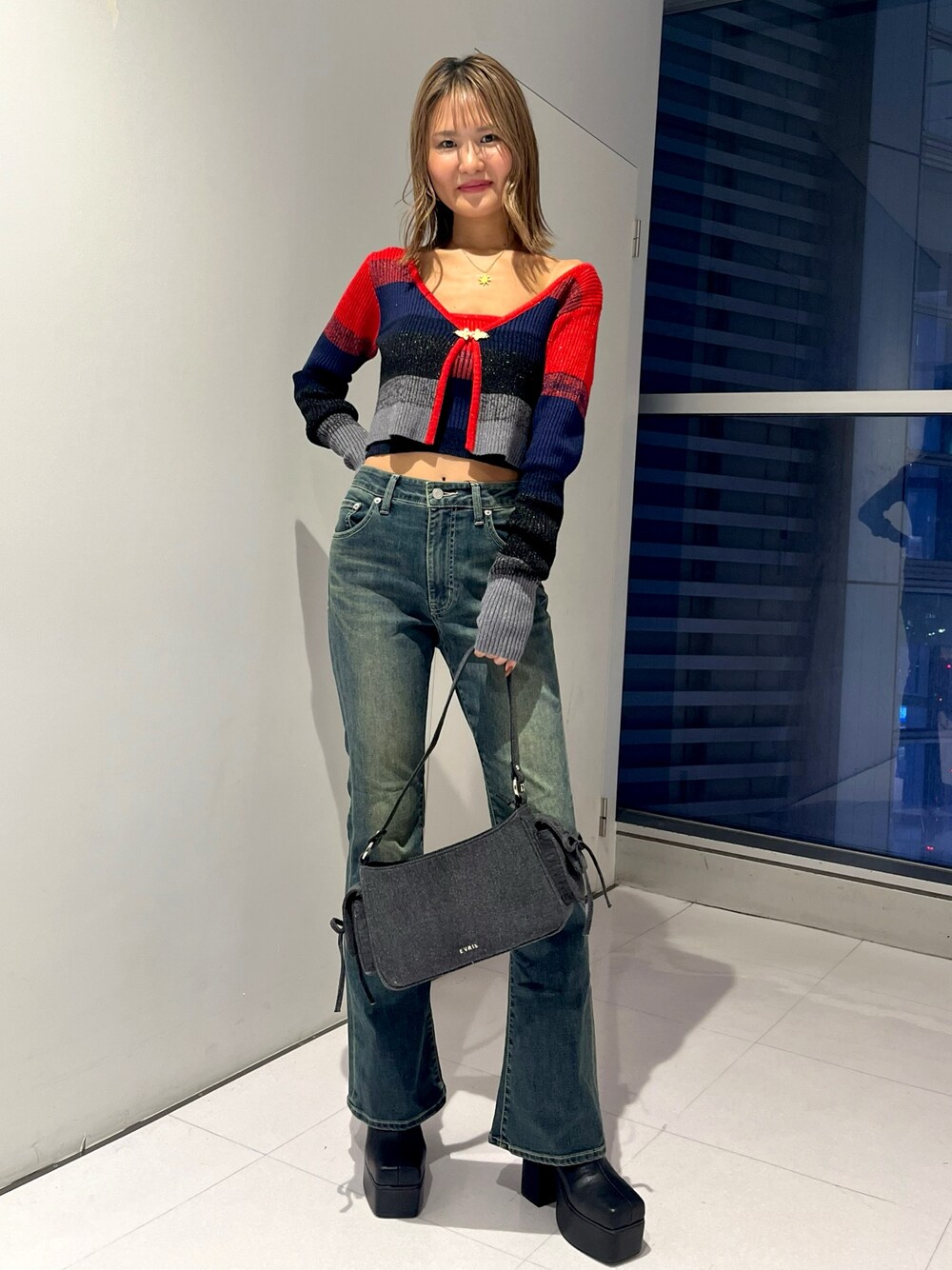 ❤️🔥ニットコーデ❤️🔥 【トップス】 アンサンブルなのでセパレートでも着用できます🌞 ラメのデザインが可愛いです❤︎ 【ボトムス】 形が綺麗なフレアパンツ💙 ストレッチもしっかり効いていて着脱しやすいです! 162cmSサイズでくるぶしぐらいの丈感です! 【シューズ】 マットな質感のカジュアルブーツ🖤 ヒールが11cmあるのでめちゃくちゃ脚盛れます🦩 普段サイズ24.5cmでLサイズ着用です! 【バッグ】 デニム✖️リボンがトレンド感◎ 収納性も抜群です!